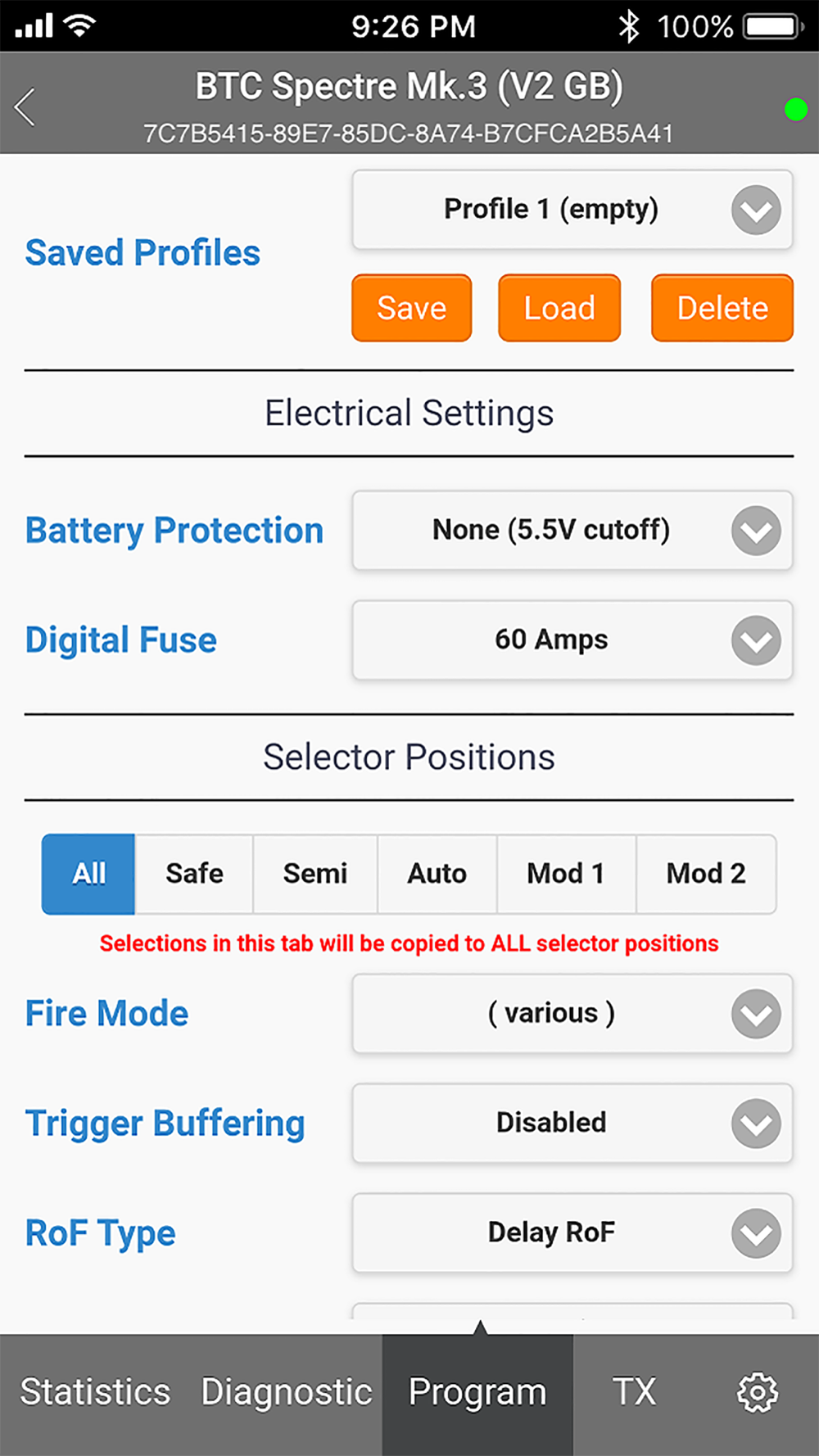 - Save and load multiple profiles to conveniently swap between settings or transfer them to other AEGs.