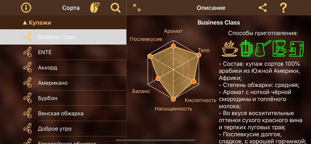 - Просмотр особенностей того или иного сорта кофе.