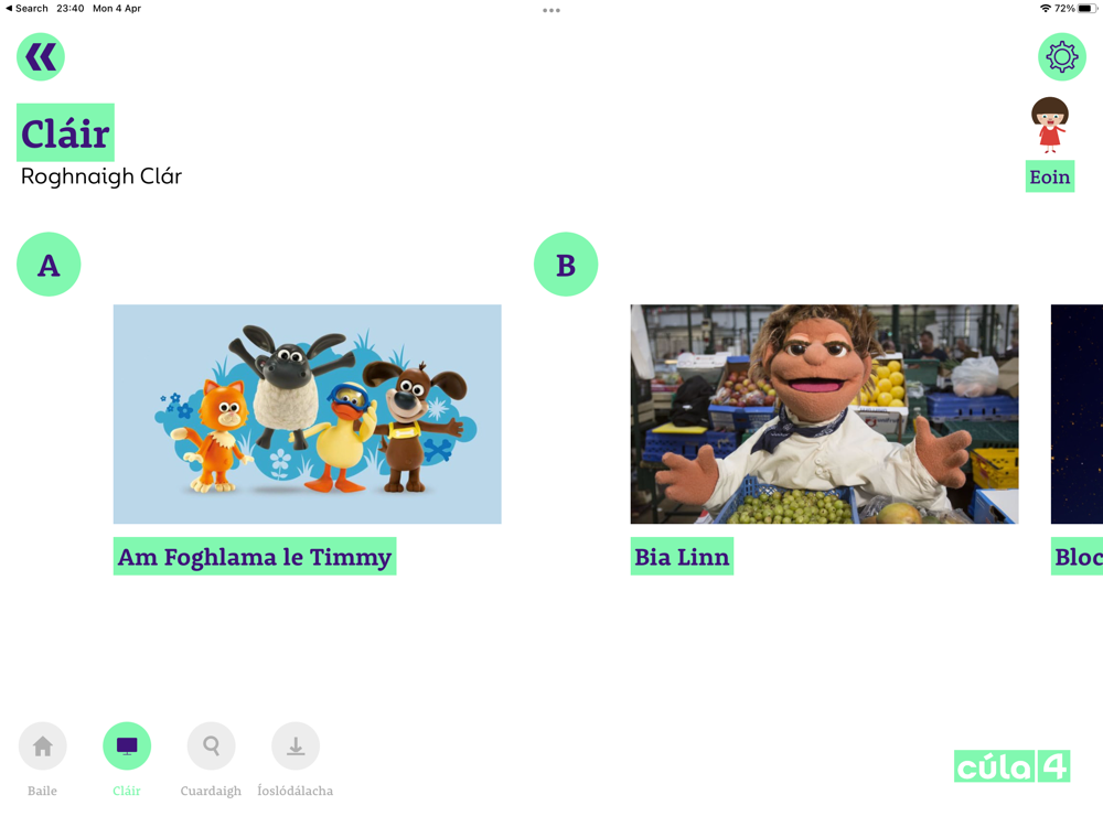 Cúla4: Seo Aip Cúla4, mar a bhfuil ábhar clár ar fáil don aos óg. Ta an Aip roinnte ina dhá aoisghrúpa, Cúla4 na nÓg atá dírithe ar lucht faoi 6 bliana, agus Cúla4 dírithe orthu siúd ós cionn 6 bliana. Seo deis le spraoi agus sult a bhaint as ábhar as Gaeilge. Beidh ábhar nua á chuir suas ar an Aip seo go rialta."