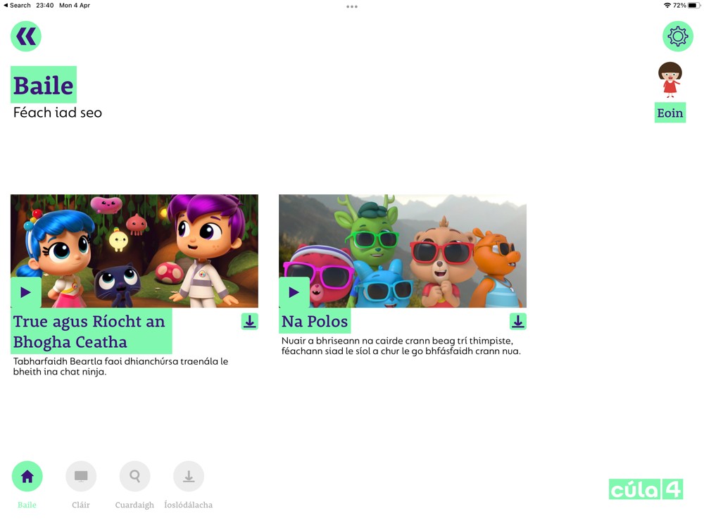 Cúla4 : Cúla4 is a free APP from TG4, which is designed to cater for younger viewers. Explore, learn and be entertained with Irish language content. Cúla4 shows are updated regularly for all ages to enjoy.