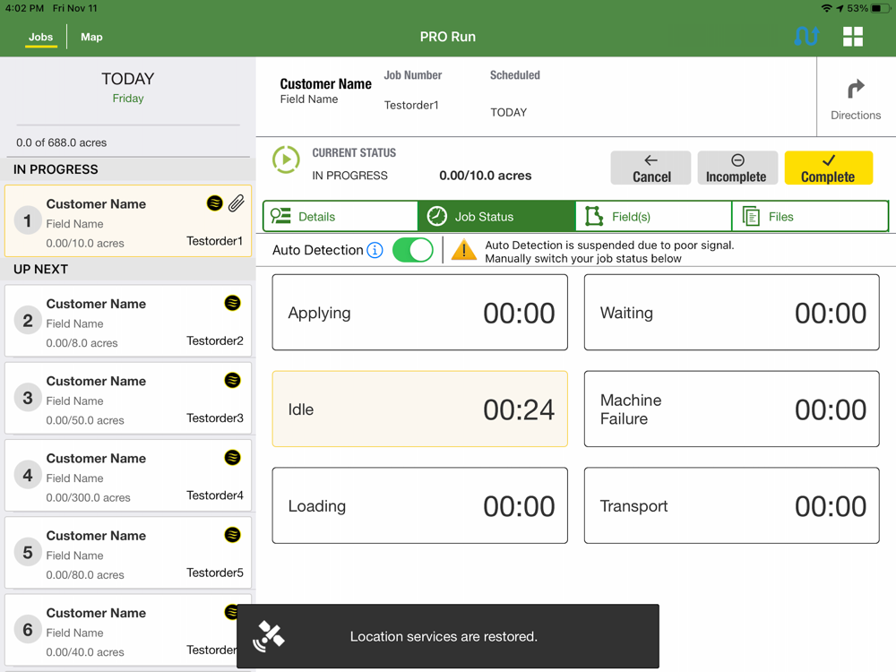 John Deere Operations Center™ PRO Run mobile app is designed to communicate with the Operations Center PRO Dispatch web application to provide a complete logistics solution that is designed for the custom application industry. It can be leveraged to meet other logistics needs in your operation. The mobile app provides operators with all the tools to: