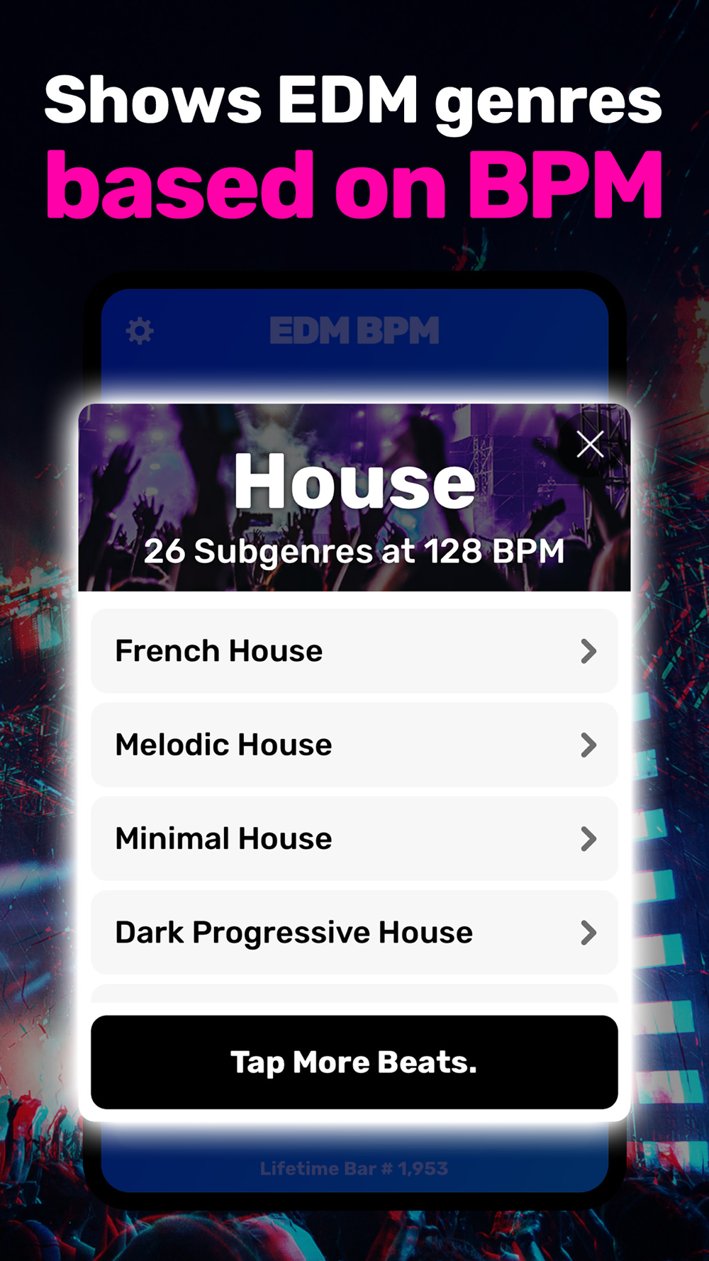 EDM BPM is an accurate BPM counter that reveals 200+ subgenres of electronic music based on genre and BPM. Become a more dynamic EDM DJ or Producer!