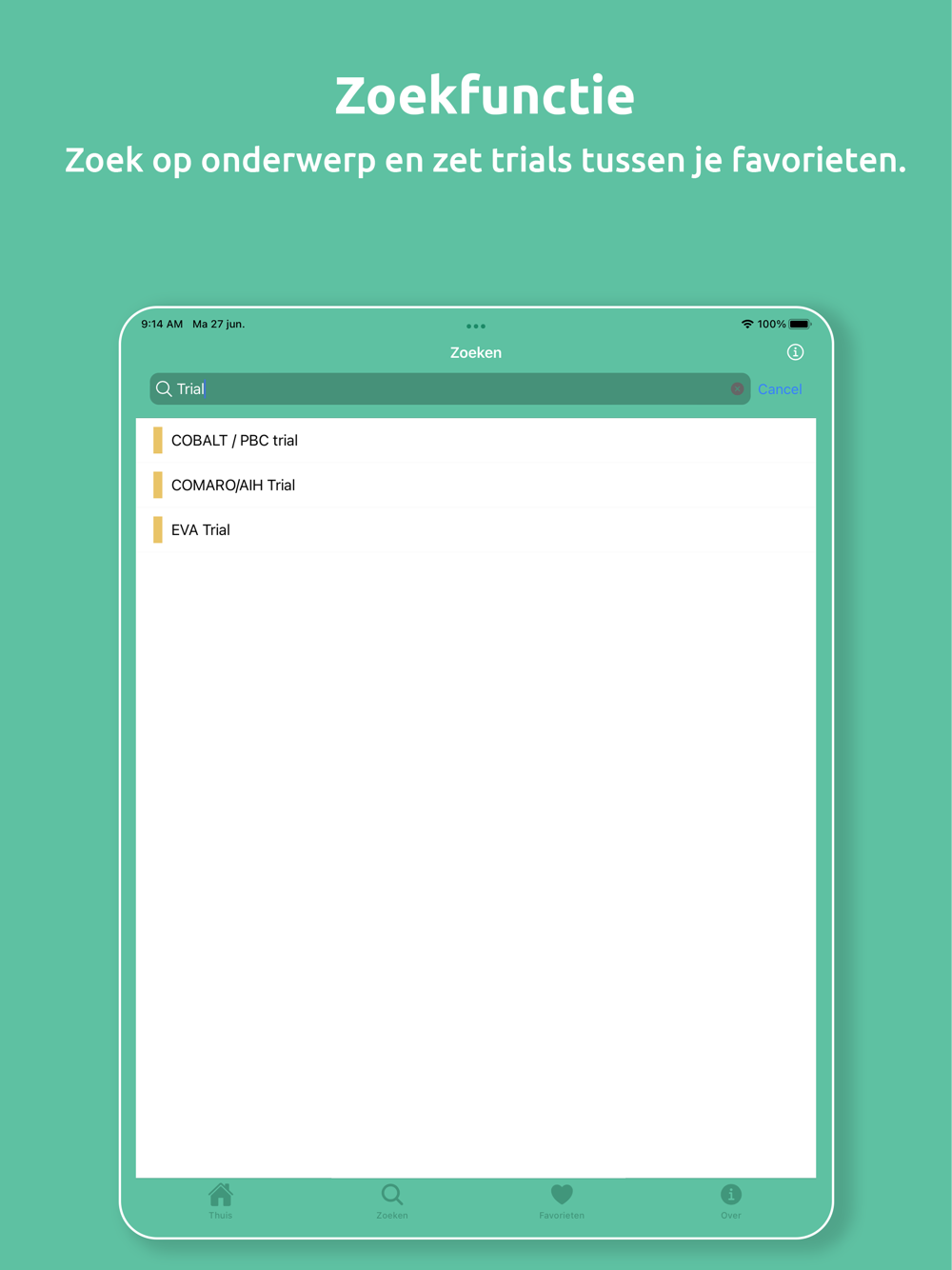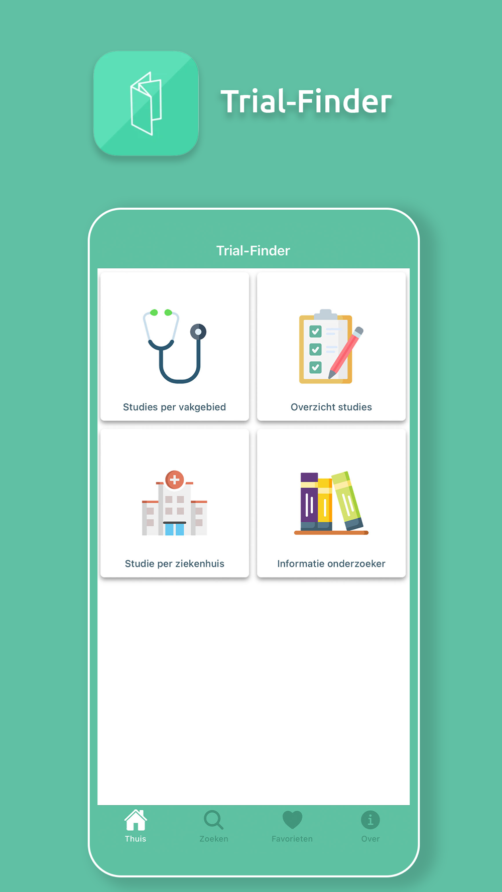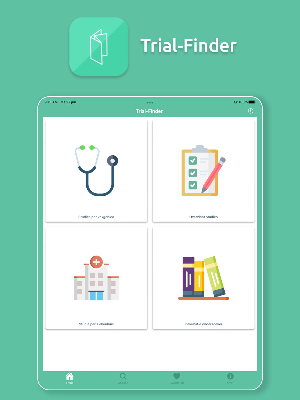 Vernieuwde Trial-Finder app van everywhereIM. Met de Trial-Finder app heeft de arts altijd zicht op de onderzoeken die lopen en waar patiënten inclusie nog een rol speelt. Er is een overzicht van alle studies, studies per ziekenhuis en studies per vakgebied.