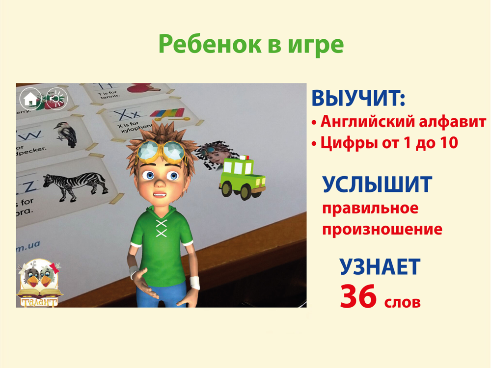Для начала познавательной игры нужно всего лишь навести планшет или телефон на QR-код, который размещен на обложке книги или плакате, — и на экране устройства появляется виртуальный учитель — мальчик Danik, вместе с которым ребенок выучит буквы английского алфавита, слова, научится строить предложения.