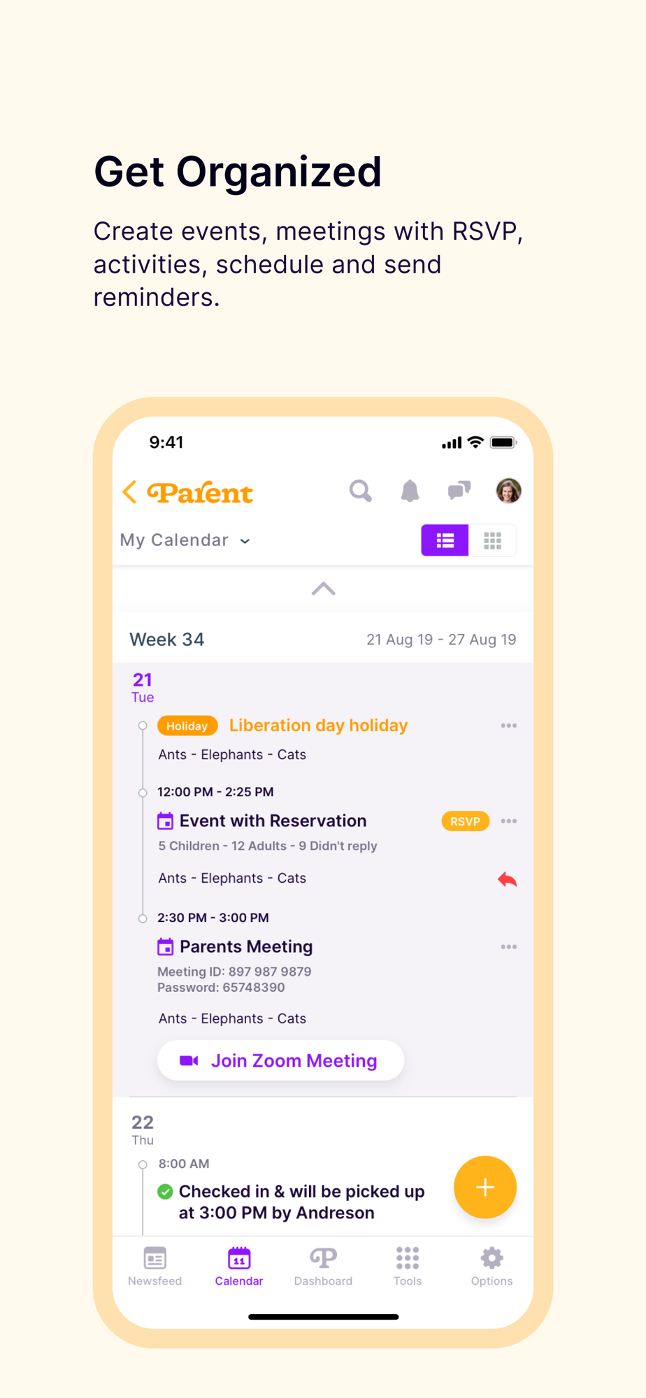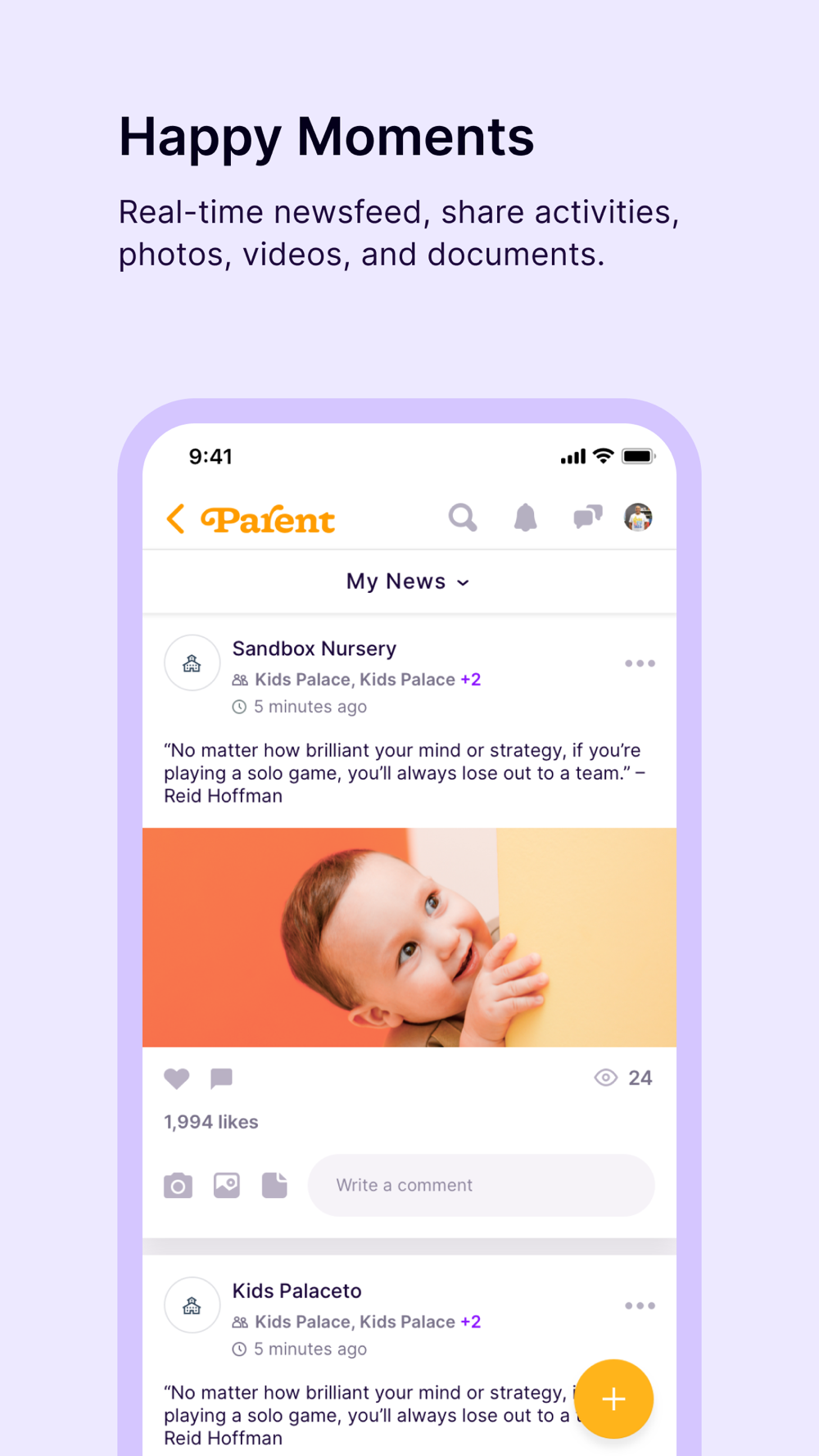 Parent is a comprehensive solution with many evolving features. This includes attendance tracking, events with automatic reminders, daily reports, detailed child profiling, child development, photo and video sharing, unlimited document storage, billing, e-learning and much more.