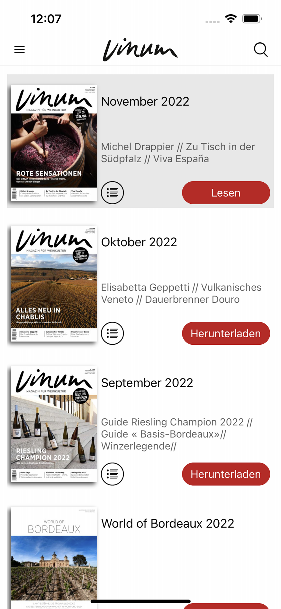 Lesen Sie Porträts von Winzerinnen und Winzern, die mit ihrem Handwerk und ihrer Qualitätsphilosophie die Weinwelt revolutionieren. Spannend geschriebene Reportagen über die Weingüter und Weinregionen dieser Welt kratzen nicht nur an der Oberfläche, sondern gehen in die Tiefe. Dazu erhalten Sie journalistisch recherchiertes, fundiertes Hintergrundwissen aus der Welt des Weins sowie Expertenmeinungen zu Entwicklungen und Trends. Mit VINUM sichern Sie sich nicht nur Weinwissen, sondern auch Lesegenuss pur.