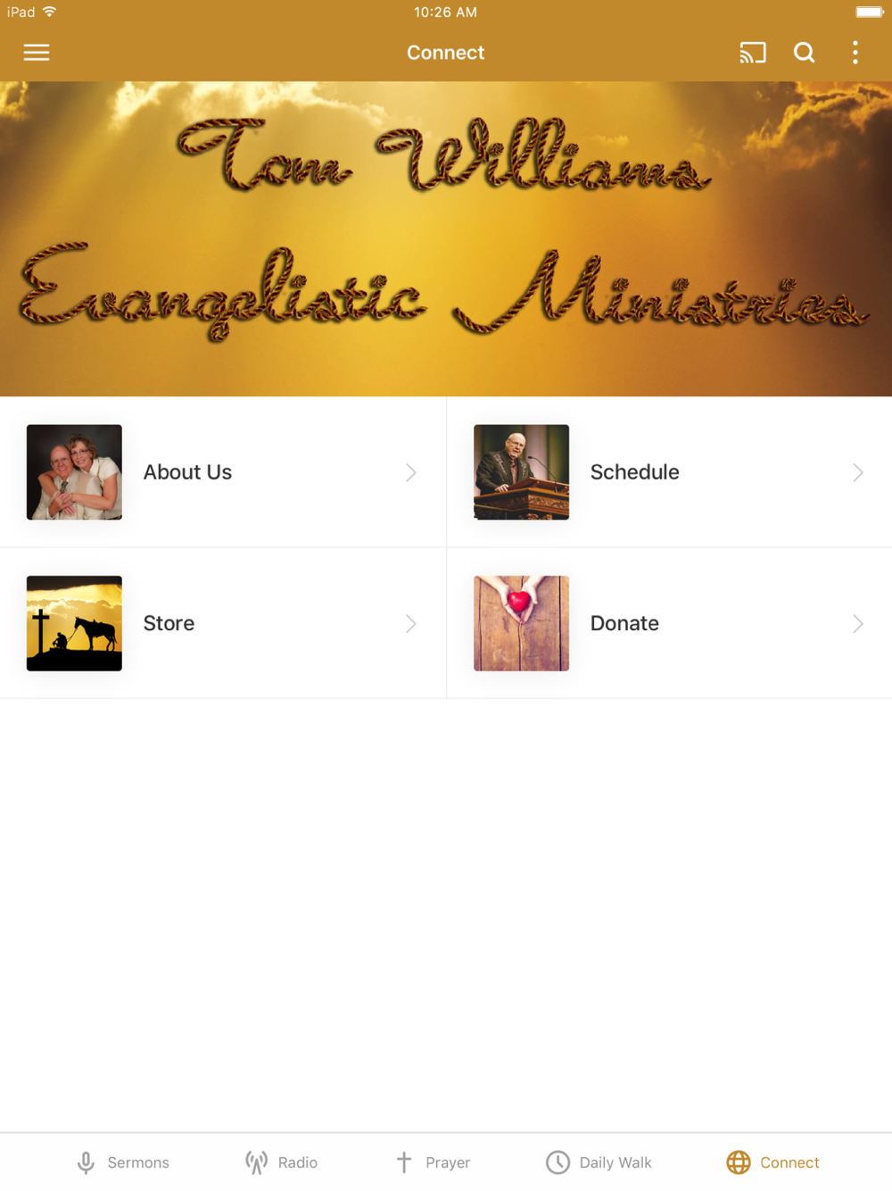 The Tom Williams Ministries App was created with the Subsplash App Platform.