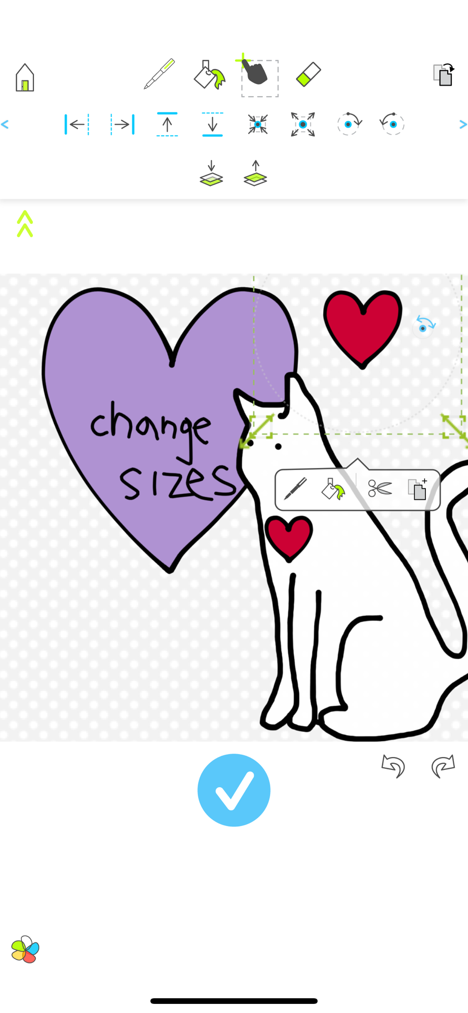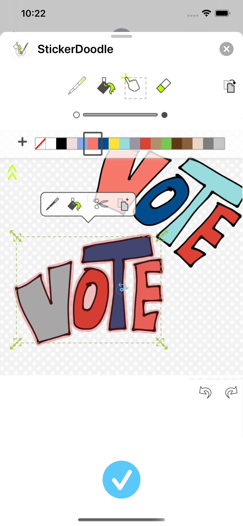 The main app is where you have the choice to make an animated sticker. With the vector-like drawing, it is so easy to create an animation. No complicated tools or commands. Just advance the screen and your doodle advances too. Add, delete, stretch, scale, move the doodles intuitively. Make your animation 2 to 8 frames long. Save it as a small, medium or large sticker.