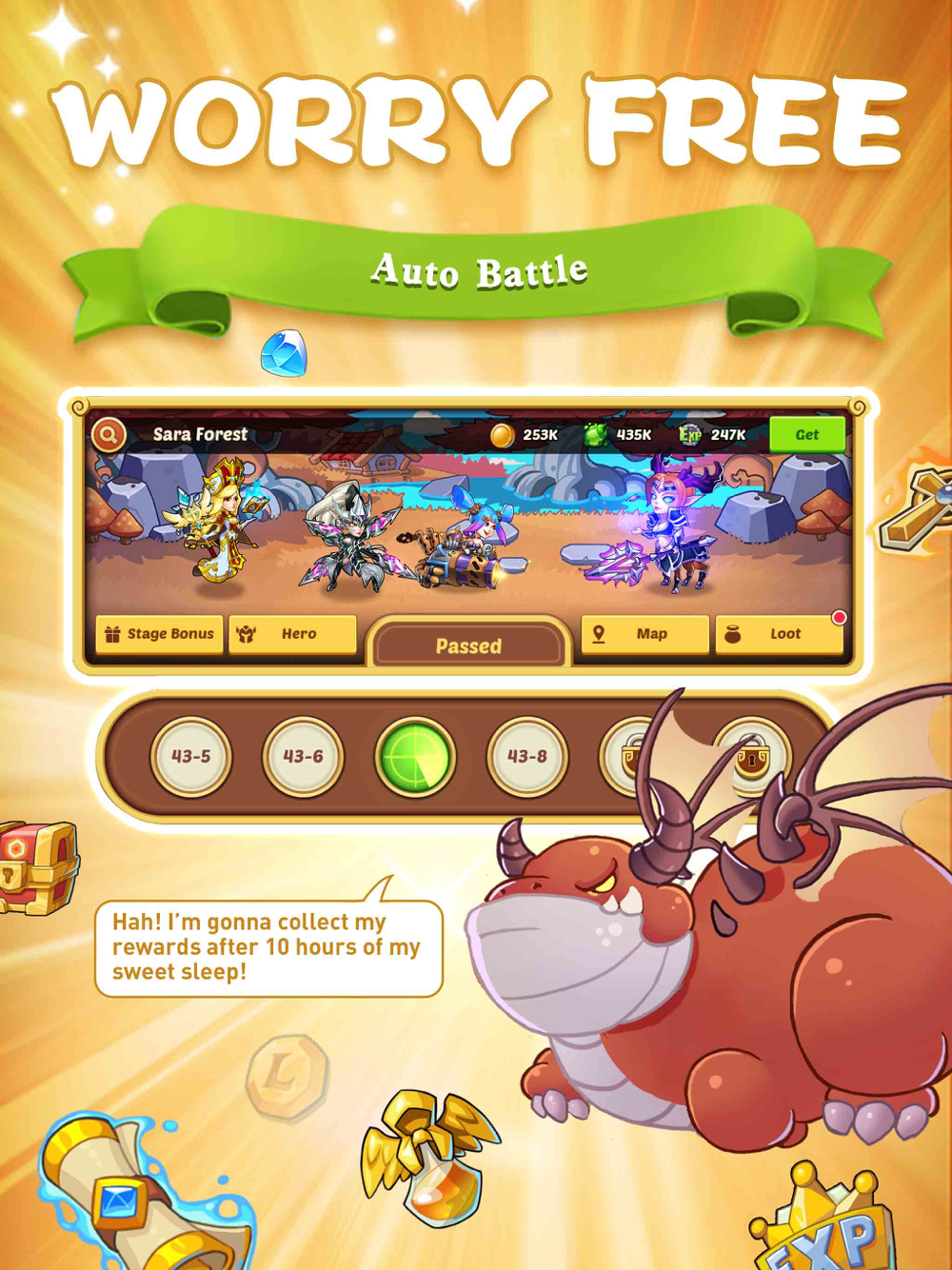 Set your heroes training while you’re away. When you return to your phone, they will be stronger, gained new abilities, and ready for battle. Grow & Train a powerful squad without all the grinding!