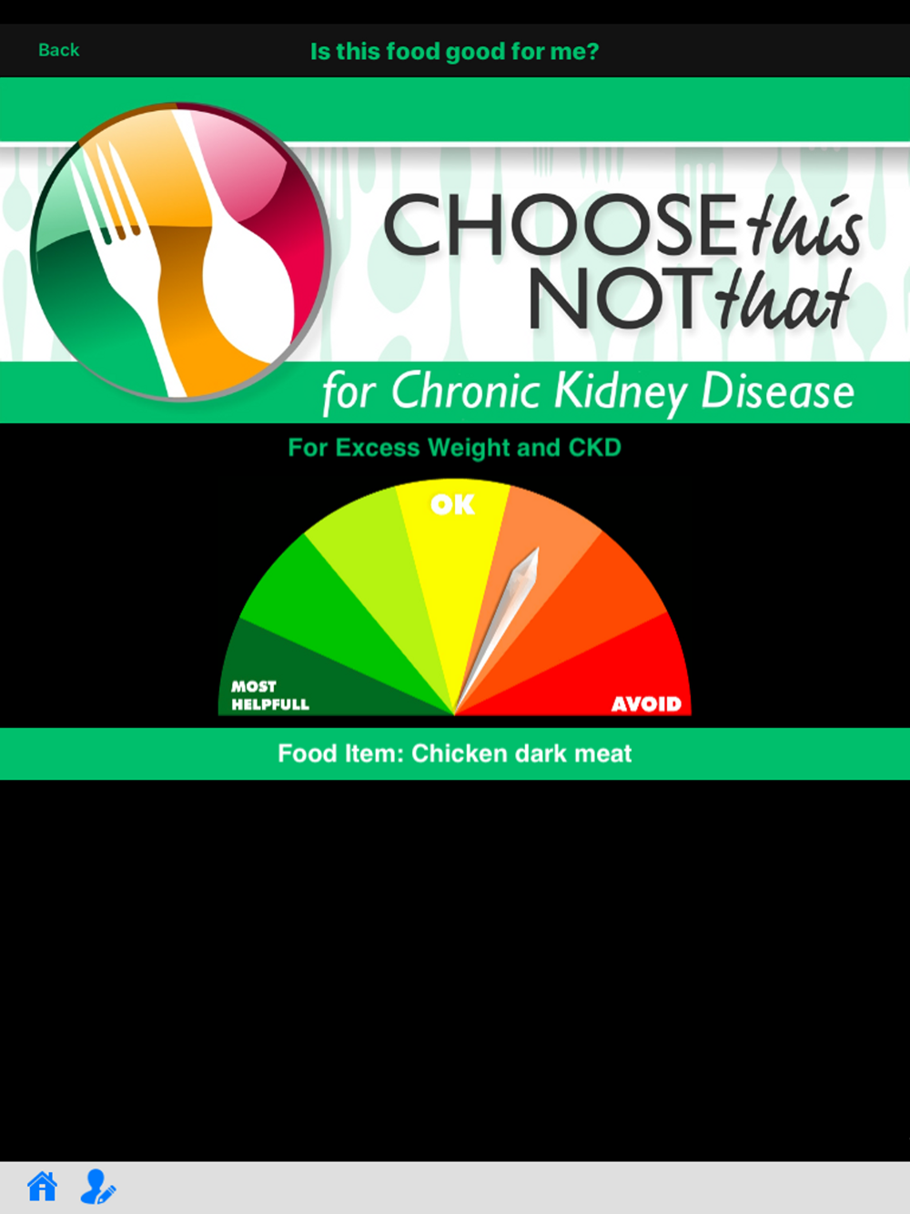 Choose This not That for Chronic Kidney Disease. Inside this colorful app, you will find easy to follow suggestions on how to improve your health through nutrition and the food choices you make every day. This app provides comprehensive and actionable nutrition guidelines for how to reduce your risk, prevent or stop the progress of CKD. If you rather tackle health issues and risks through proper nutrition and lifestyle changes then this app is for you! Last update: June 2017.