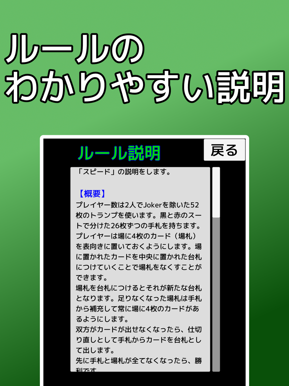 Speed is, as the name suggests, a game where speed is important. It is a battle-type game in which two people divide the cards and the one who loses all the cards first wins. Unusually for card games, it is a game where motor nerves and reflexes are important.