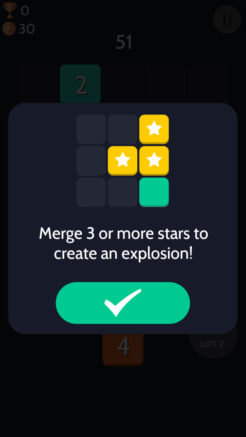Unite is the new addictive logic puzzle you brainiacs have been waiting for! The player's task is to strategically place blocks with different numbers on the board, so that three or more matching blocks will merge into one block of the next higher number. If you combine three or more sixes, they will merge into stars, which again merged, will clear a huge part of the board in an explosion.