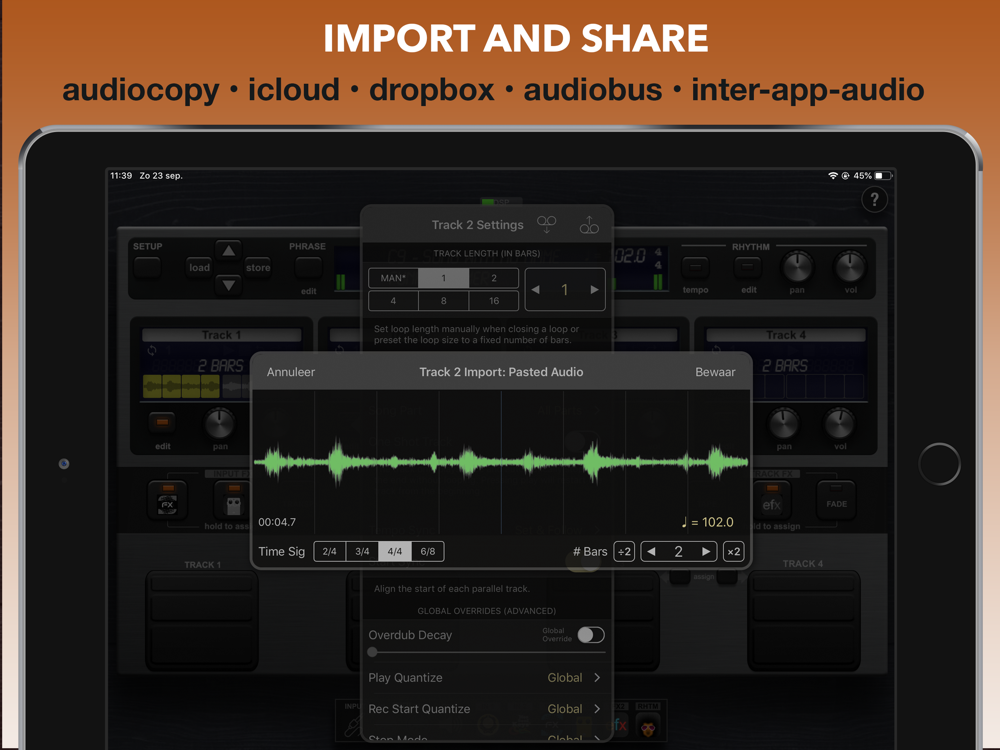The builtin rhythm guide provides a rhythmic backing. Use the internal metronome for practice, import drum loops from virtually anywhere or host and control your favourite rhythm apps to enhance your performance. MIDI master lets you control MIDI hardware, and MIDI slave lets Quantiloop follow it. Ableton Link lets you even play in time over WiFi with external apps and devices. Quantisation aligns your actions to the nearest measure or beat so you stay in time, and real-time tempo control sets the pace. Prefer setting your own pace, disable quantisation and Quantiloop will react to your actions with minimum latency to create tight synchronised recordings.