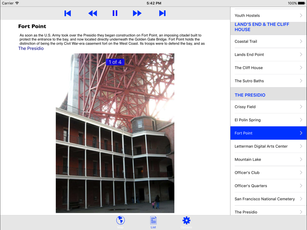 This app guides you through the Golden Gate National Recreation Area, one of the most visited National Parks in the United States, hosting over 13 million visitors per year. It is also one of the largest urban parks in the world with a size almost 3 times that of the consolidated city and county of San Francisco, where much of the developed park resides. This tour through the GGNRA will include units within the city of San Francisco: the historic Presidio, Maritime Museum and Fort Mason, along with the wilderness regions of Lands End, Ocean Beach, and Fort Funston.