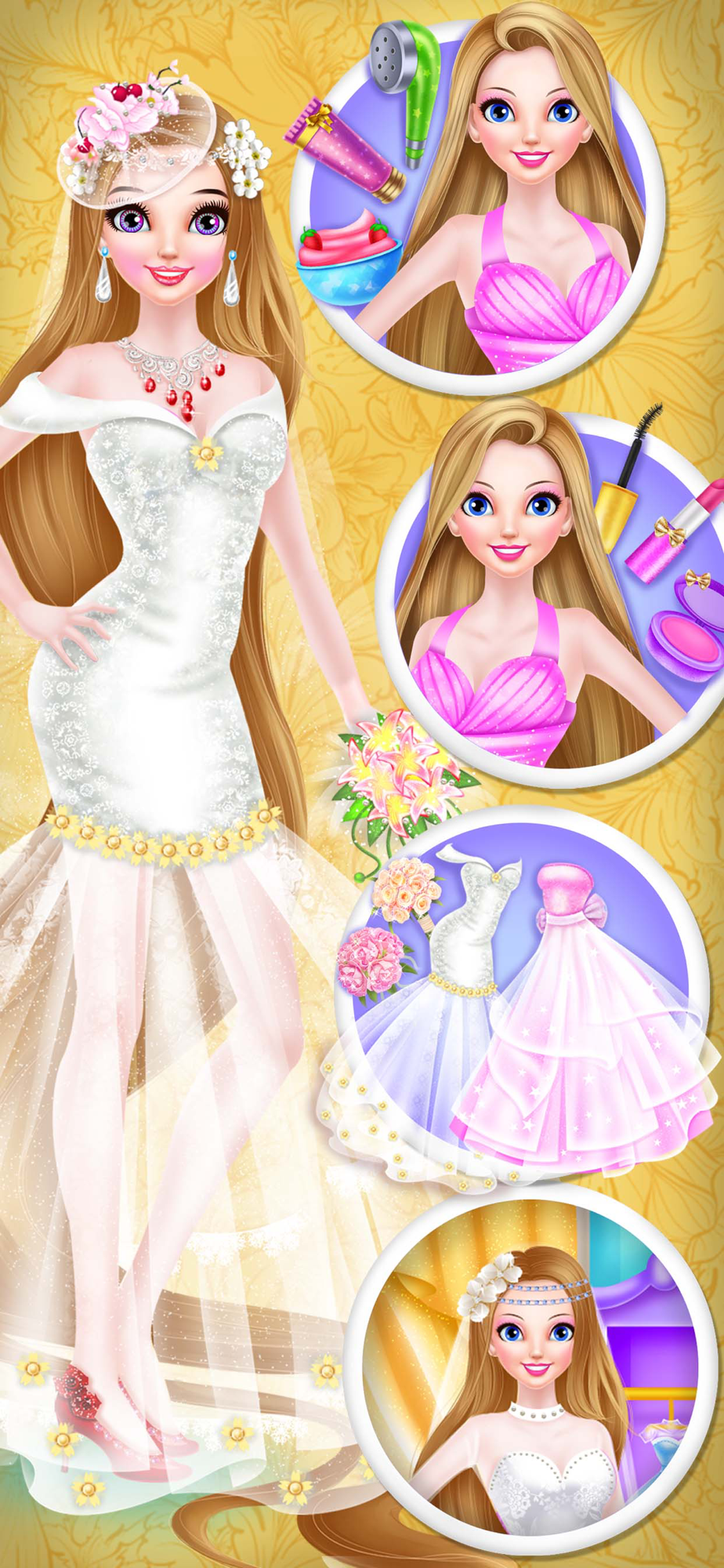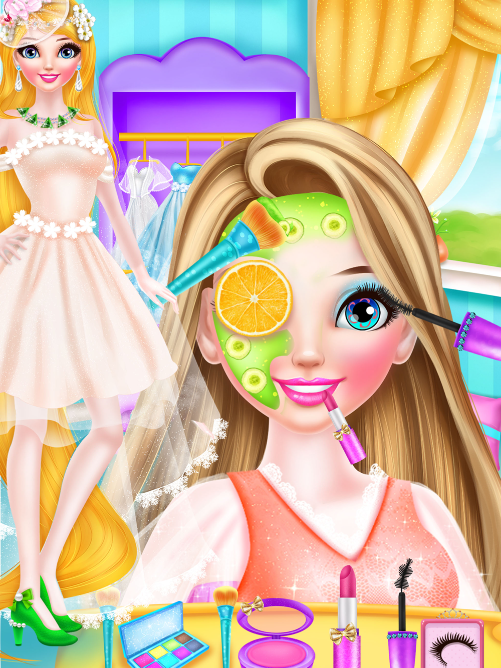Lovely long hair princess is going to hold her excellent wedding today. Come to be her wedding assistant and help her make up to become the most beautiful bride. First step, you need to help the princess make a facial spa. Clean her face skin and then use our professional tools to get rid of her pimples one by one. After that you can come to make facial and eyes masks for several minutes and then put some facial creams and lotions to make her face skin look fresh and amazing. The second step, you can try your best to help her make up. Choose the suitable eye brow and eye shadow colors for her. Try your best to decorate her beauty with lipstick and blusher. The third step, you can show us your excellent dressing up skill, mix and match those beautiful wedding dresses,hold flowers and accessories until you find the best one that suits the long hair princess for her wedding. Show us this marvelous princess and her prince at last.