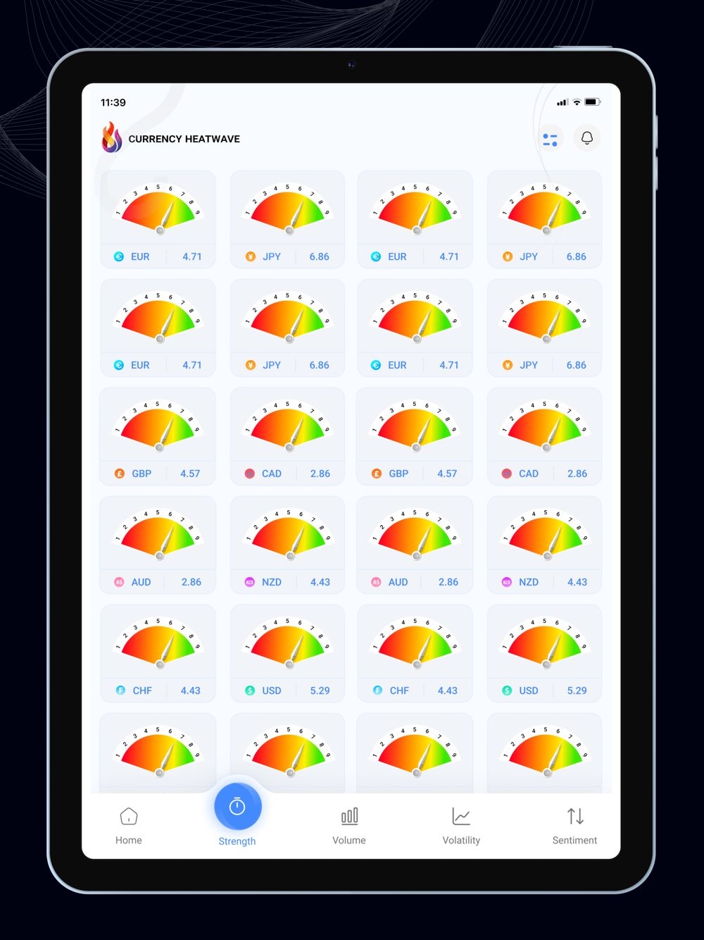 The app has 6 screens covering 4 important aspects of trading that is Currency Strength, Volume, Volatility and Sentiment.