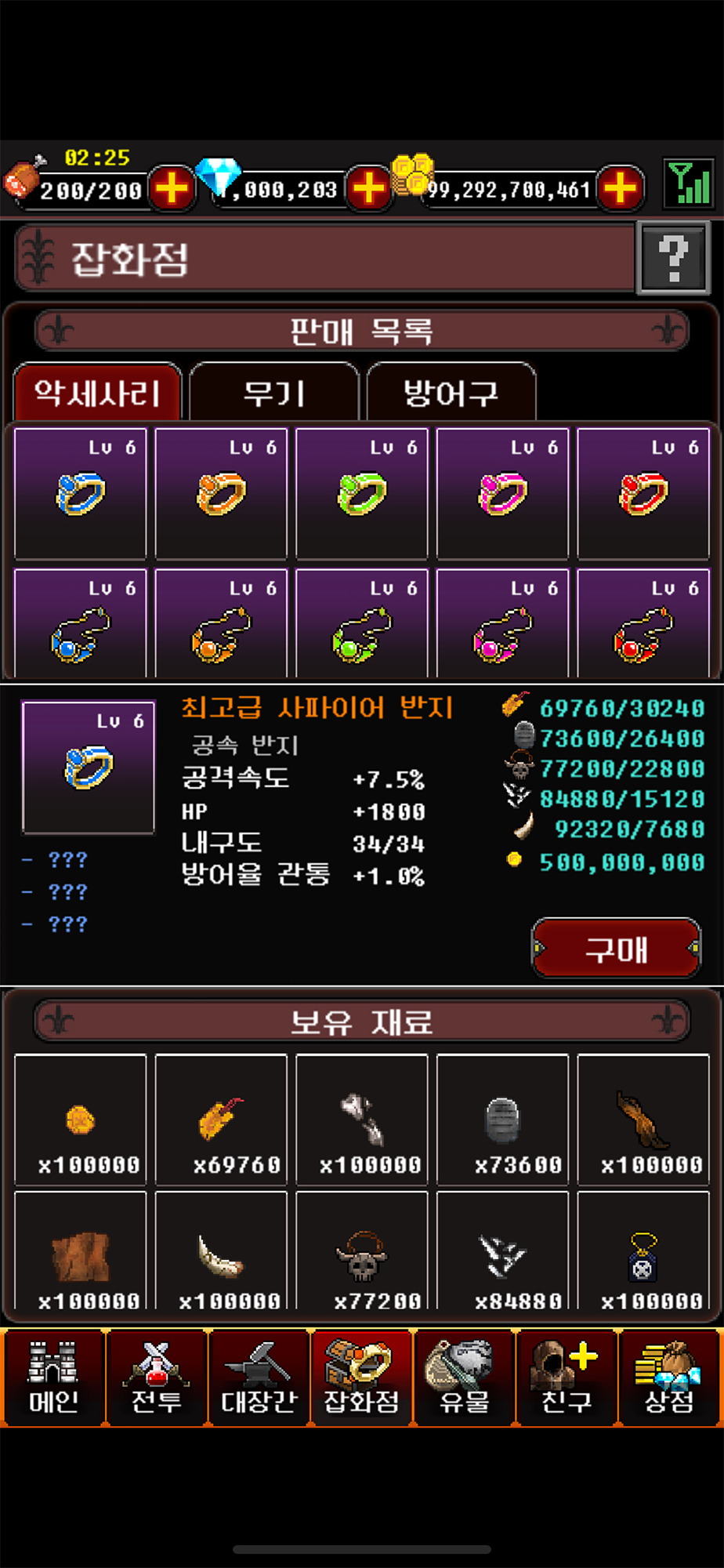 - Axe: Damage / Critical probability are pretty high but the Attack Speed / Accuracy