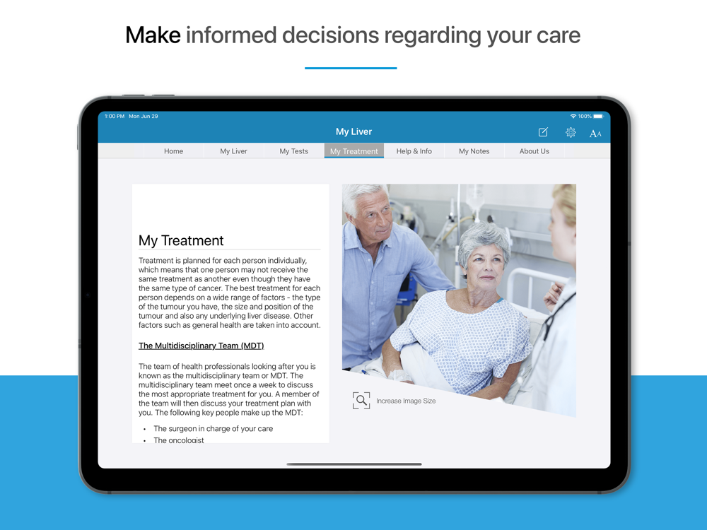 "My Liver" has been developed as an educational resource for NHS patients facing a diagnosis of liver cancer. It guides a patient through their journey from initial referral to treatment, how to manage symptoms and where to find further information and support. It also acts as an information resource for their family members, carers, and friends.
