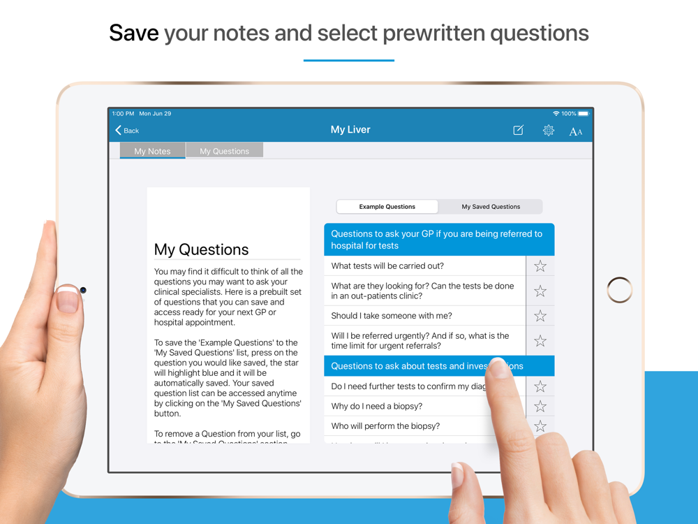 The last section includes an area where you are able to write and save any important information you may wish to ask at your next GP or hospital appointment. Or for ease, a list of pre-written questions that can easily be selected and saved ready to ask the specialist at your consultations can also be used.