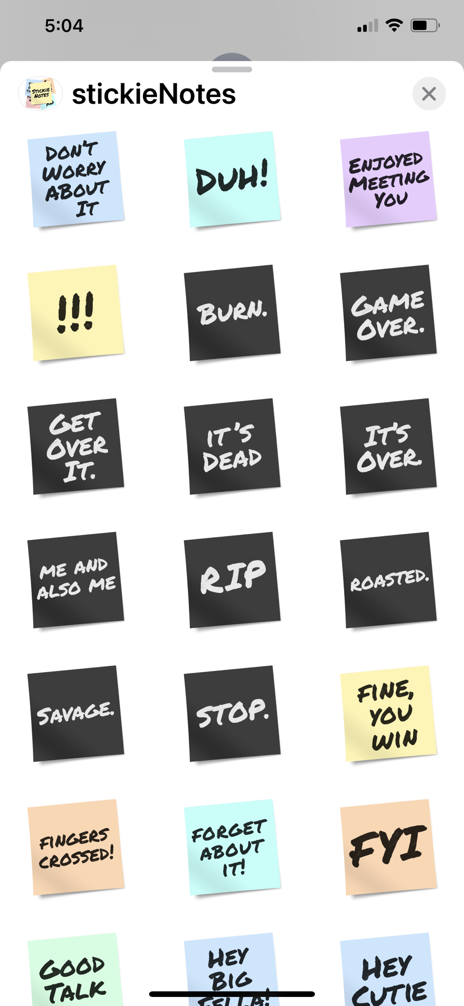 Bring one of the most useful and handy ways to communicate in real life to your iMessages with stickieNotes. Save time and get your message across clearly and often humorously with useful messages like “What Time?”, “Stop By My Office”, and “Hey Big Fella!”.