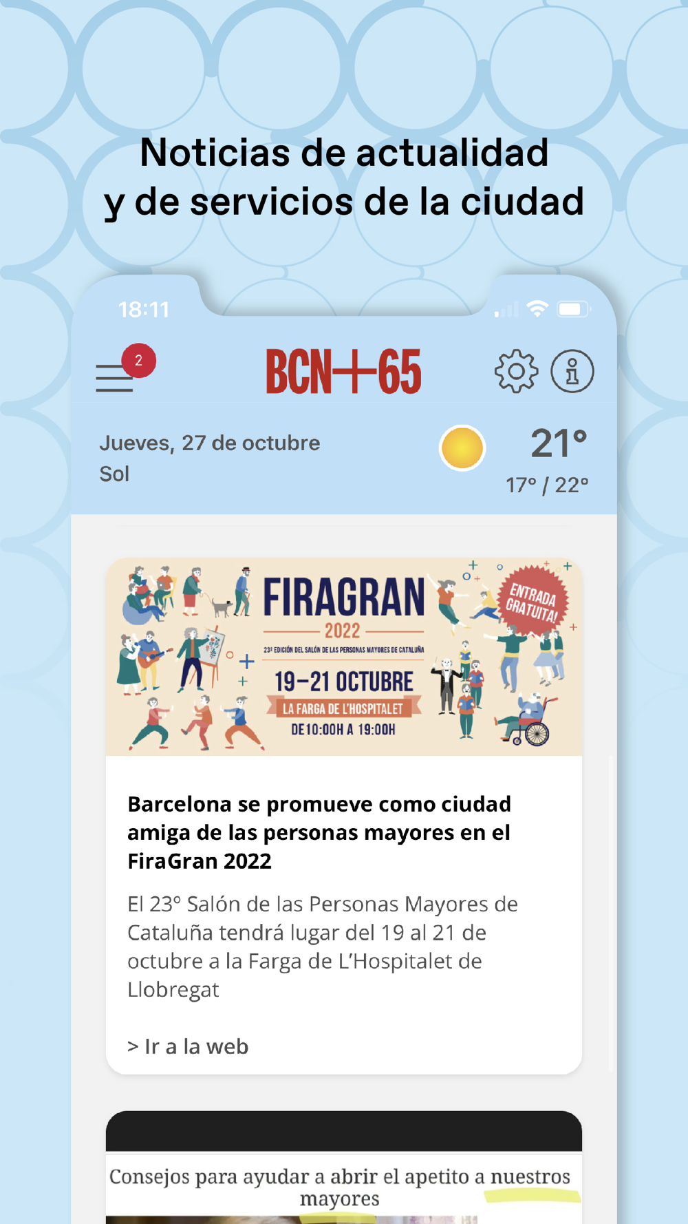 BCN+65 es la app de las personas mayores de Barcelona. Reúne, de forma fácil y accesible, toda la información de actualidad y los principales servicios y recursos municipales para las personas de más de 65 años de la ciudad en un solo punto de acceso. Además, la aplicación cuenta con un servicio de avisos para ajustarse mejor a cada persona usuaria, e integra el servicio VinclesBCN, que refuerza las relaciones sociales de las personas mayores que se sienten solas.