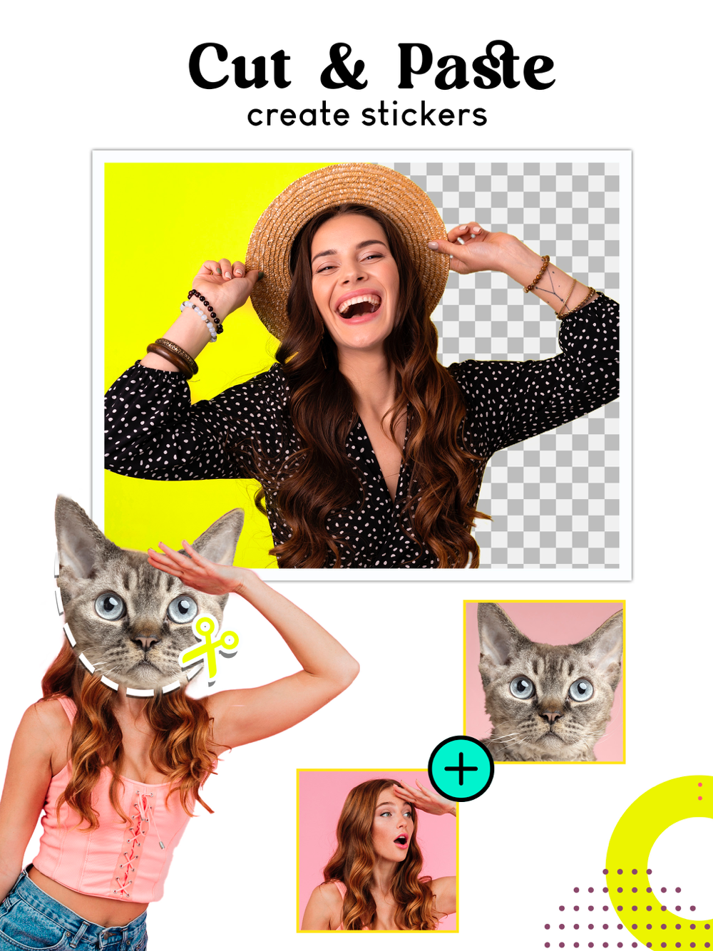 Are you looking for simple photo editing tricks, photo montages and face swaps? Cut and paste photo editor let you create your own personalized fun photo stickers. Add your personal photos and start to decorate your images with fun stickers.