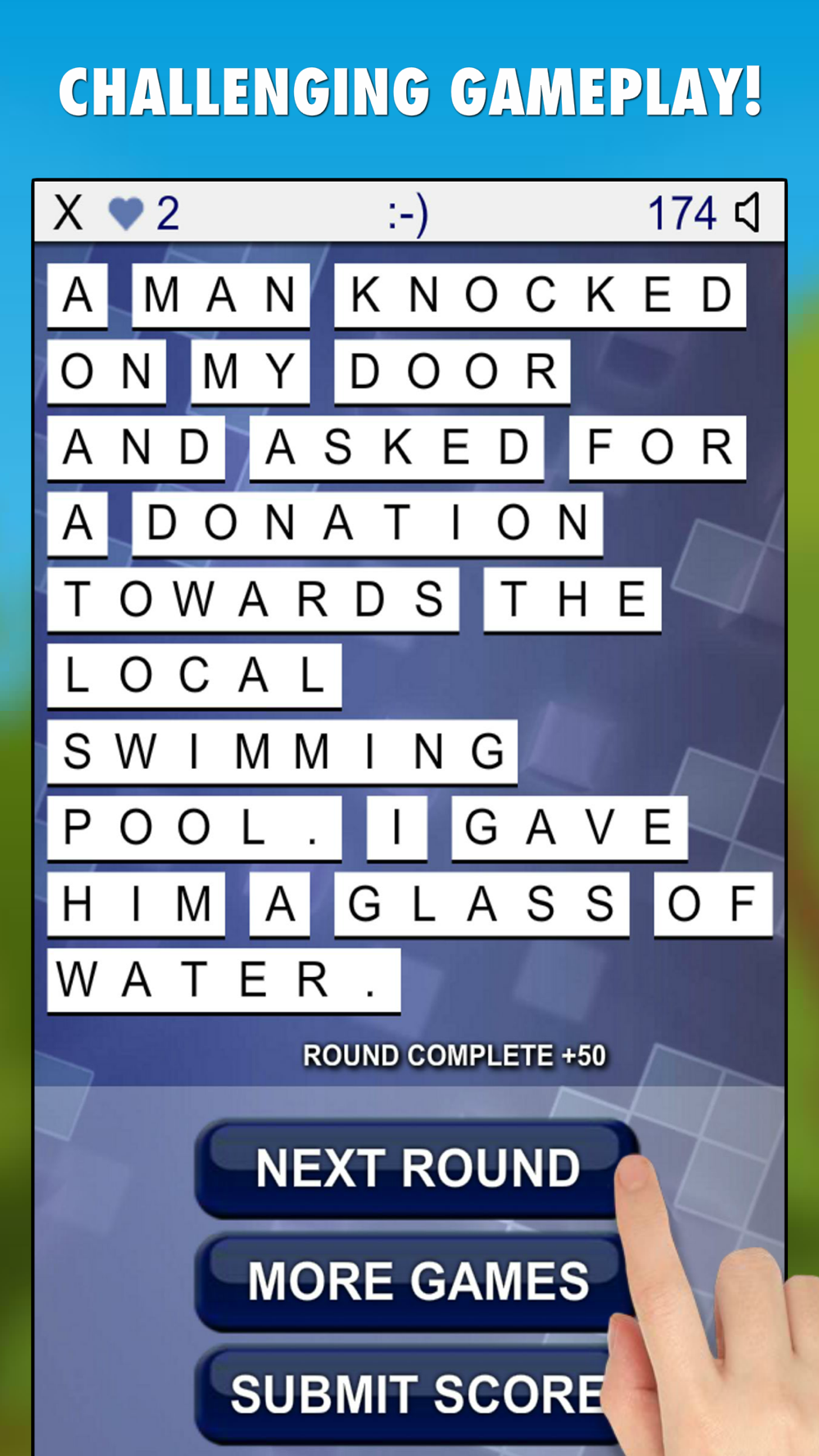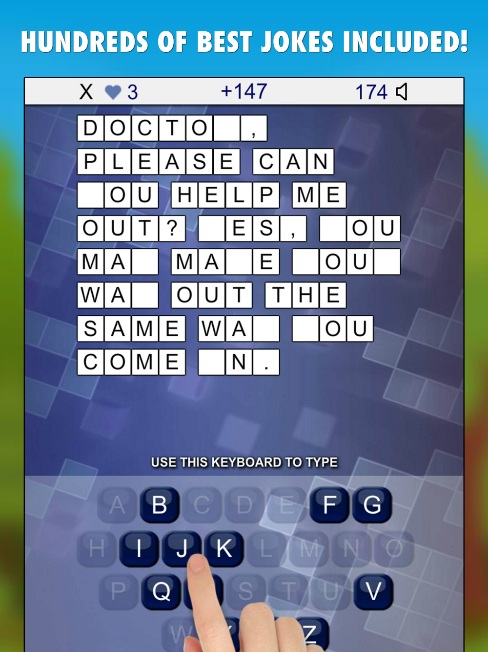 Simply tap on the letters provided and try to guess the hidden joke! Faster you solve each round, the better score you get! You get extra 50 points for each round complete and +500 points if you complete all 8 rounds! Watch out, you have limited number of lives and there is a time limit of 180 seconds for each round! Don't forget to submit your score at the end of the game to see who is the best in guessing jokes!