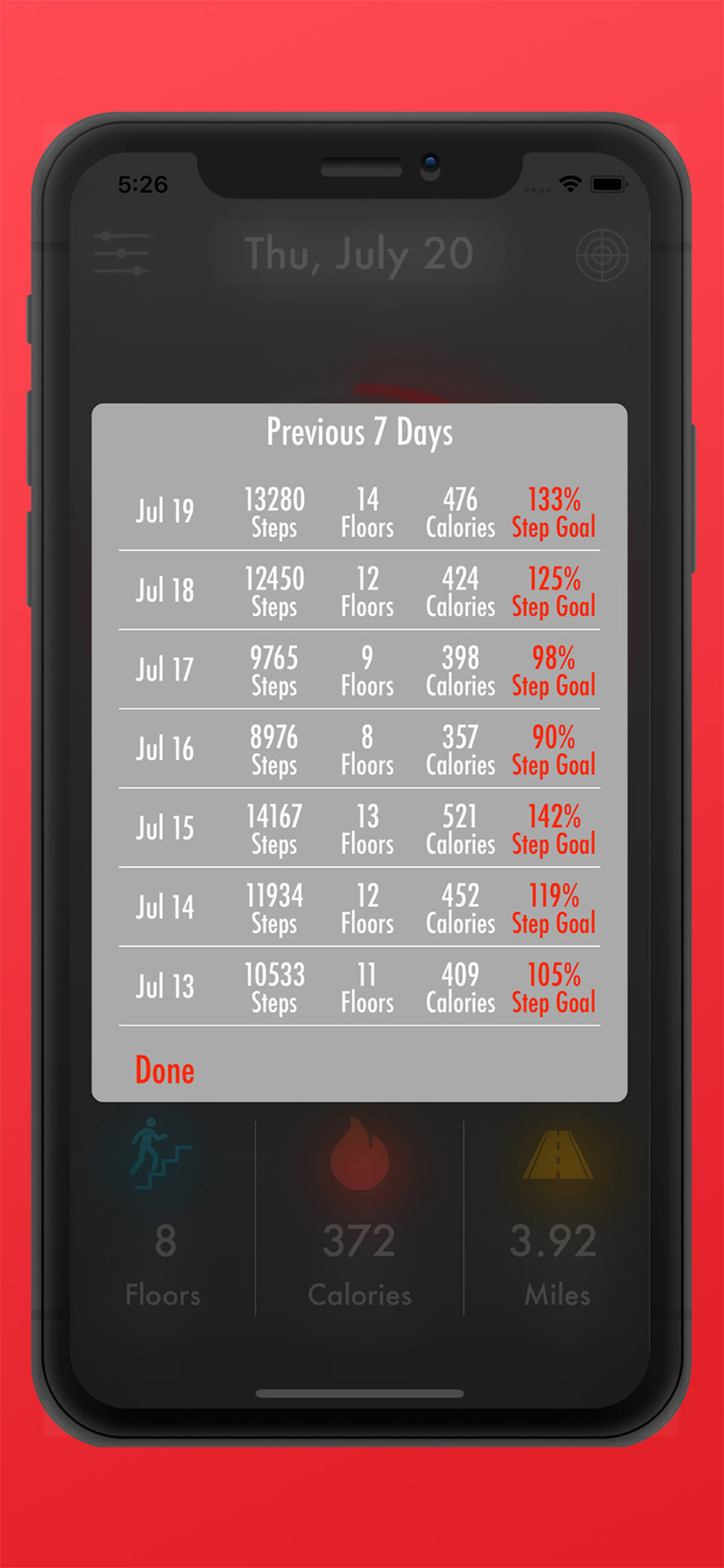 Everyone should try to walk 10,000 steps each day. Next Step is designed to make tracking steps, Calories, and Flights Climbed easier.