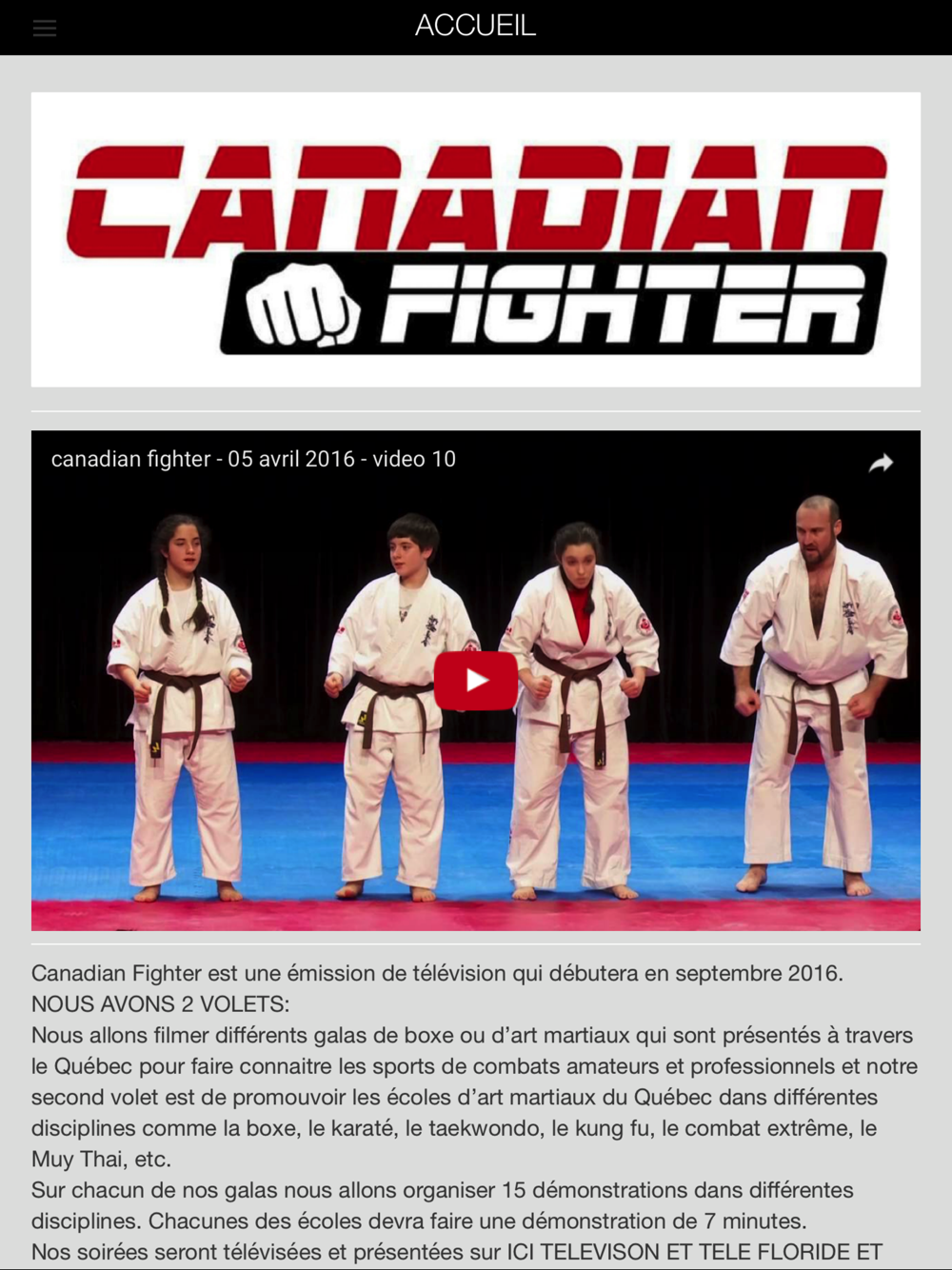 Nous allons filmer différents galas de boxe ou d’art martiaux qui sont présentés à travers le Québec pour faire connaitre les sports de combats amateurs et professionnels et notre second volet est de promouvoir les écoles d’art martiaux du Québec dans différentes disciplines comme la boxe, le karaté, le taekwondo, le kung fu, le combat extrême, le Muy Thai, etc.