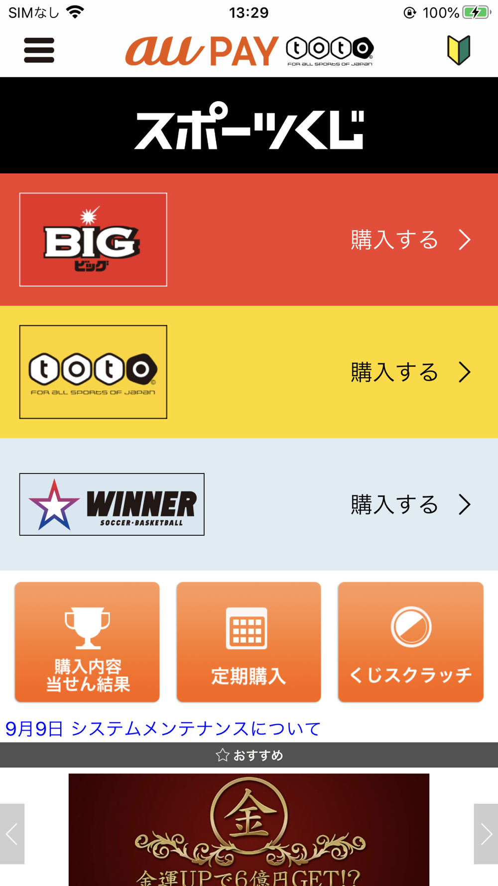 スポーツ振興くじ「BIG」「toto」「WINNER」の締切やくじ購入するための各種情報、au PAY totoで実施中のお得なキャンペーン情報が簡単に手に入る便利なau PAY toto公式アプリ。