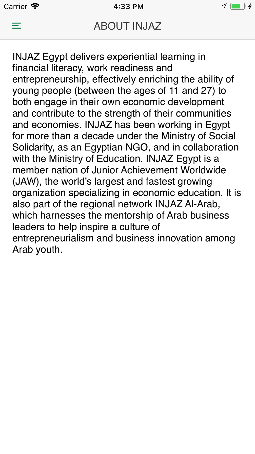 INJAZ has been working in Egypt for more than a decade under the Ministry of Social Solidarity, as an Egyptian NGO, and in collaboration with the Ministry of Education. INJAZ Egypt is a member nation of Junior Achievement Worldwide (JAW), the world’s largest and fastest growing organization specializing in economic education. It is also part of the regional network INJAZ Al-Arab, which harnesses the mentorship of Arab business leaders to help inspire a culture of entrepreneurialism and business innovation among Arab youth.