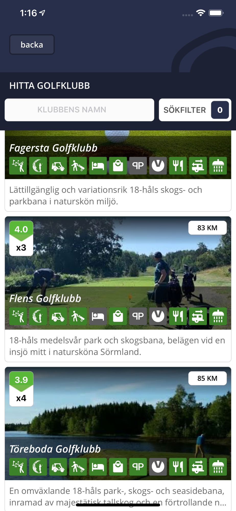 - Filtrera golfklubbar med faciliteter, golfdistrikt, betyg, m.m.