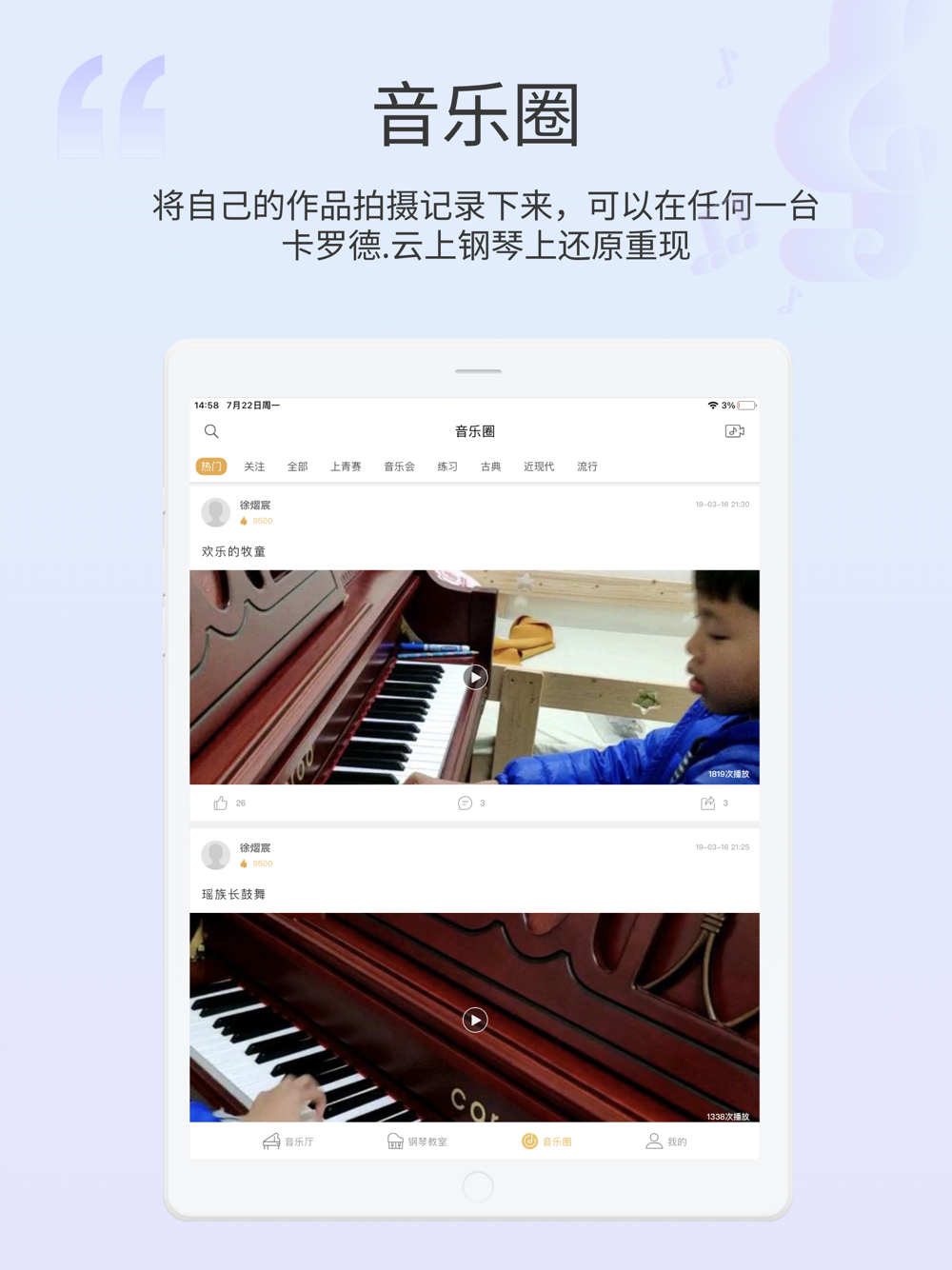 发布演奏视频、点赞、转发、评论,化身钢琴达人,登上热门排行榜。