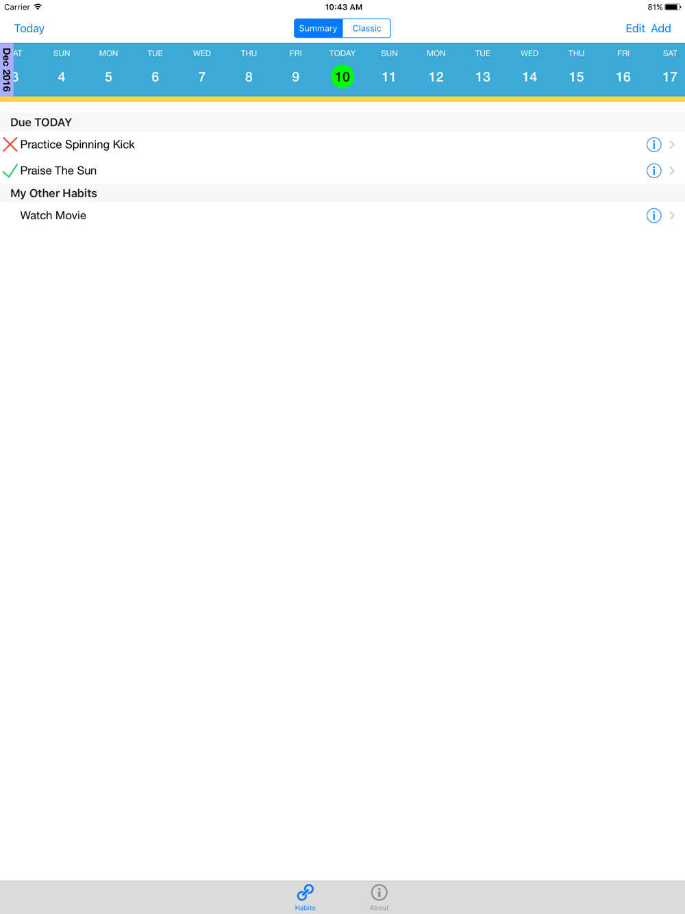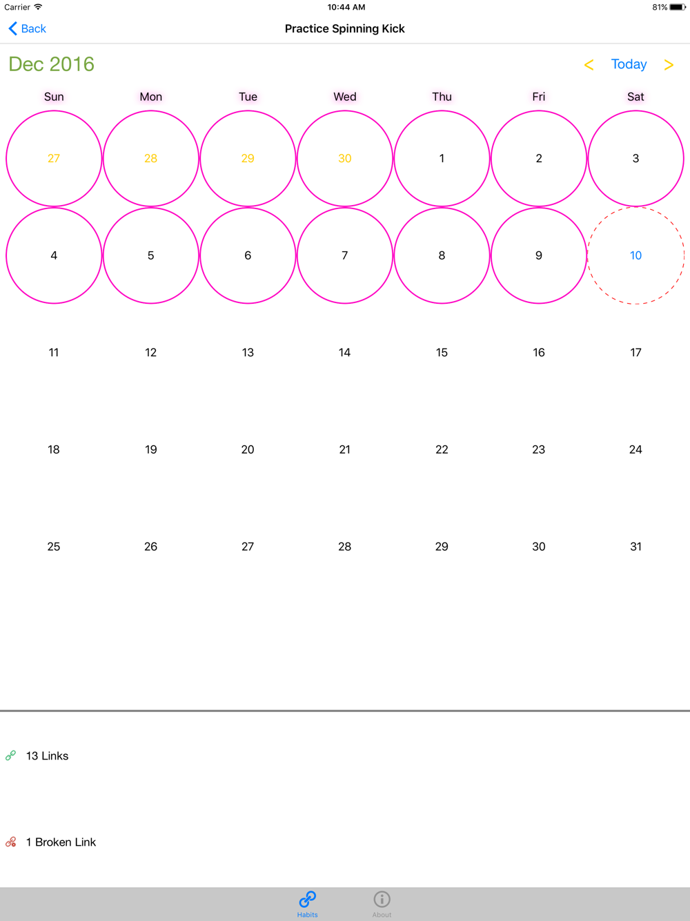 This app has been updated by Apple to display the Apple Watch app icon.- added ability to switch between Horizontal and Monthly calendars. A smart man told me that each time a link is added in the Monthly view, a sense of accomplishment is felt- added automatic daily reminder. think you're going home to eat cake? think again! reminder says gym time! bam!- minor cosmetic fixes