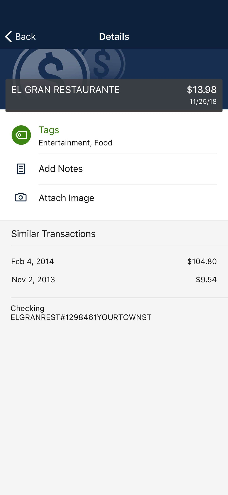 Add Tags, Notes, Images & Geo-Information: By enhancing transactions with custom tags, notes or photos of a receipt or check, you have the ability to stay organized and find exactly what you’re looking for when searching through your finances.