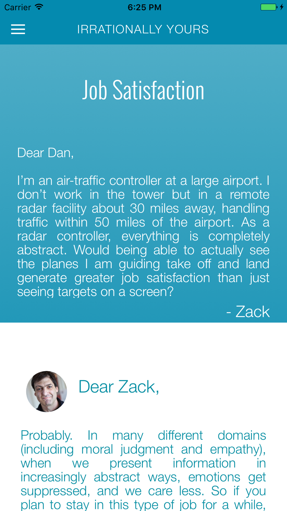 This app brings you excerpts from the book Irrationally Yours: On Missing Socks, Pickup Lines, and other Existential Puzzles, and from Dan’s Wall Street Journal column, “Ask Ariely.”