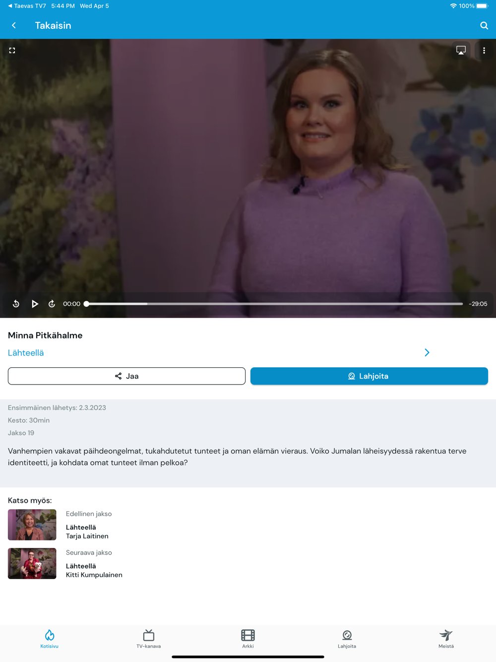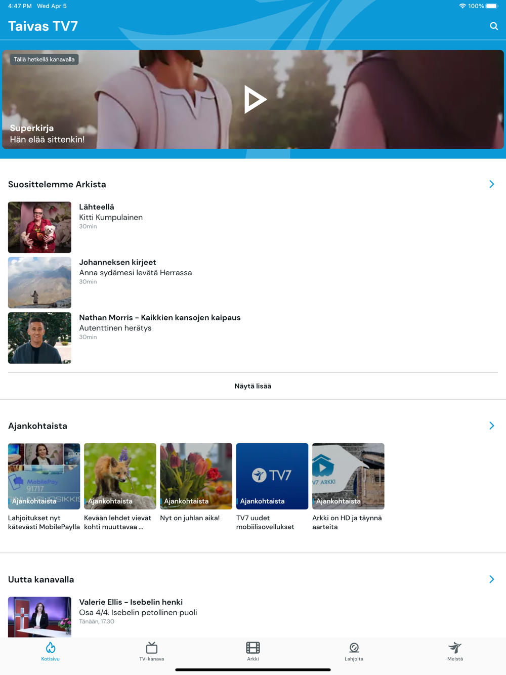 Taivas TV7 -sovelluksen Arkissa julkaistaan kaikki esitetyt ohjelmat, jotka Taivas TV7:n on mahdollista julkaista netissä. Tekijänoikeudet rajoittavat mahdollisuutta tarjota kaikkia lähetettyjä ohjelmia.