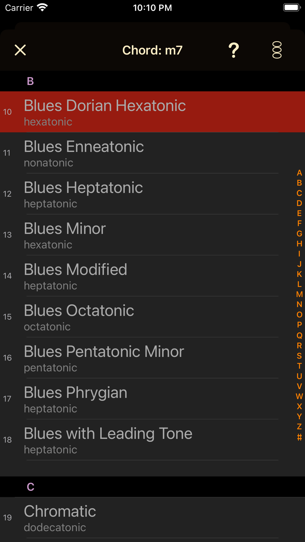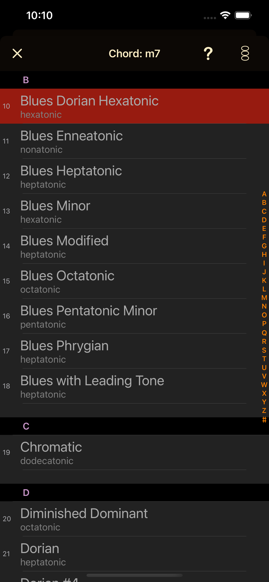 The chord/scale realtionship is of particular importance to improvising musicians. ScaleMaster allows to filter down the existing vocabulary of 211 scales with 41 of the most common chord structures. The resulting group of scales then fully consists of only scales including all chord tones. This is reflected in the notation view which highlights chord tones in red and displays a chord symbol below the scale title. This feature allows to open up and enrich the improviser's palette and give him or her an alternative to the go-to choice.