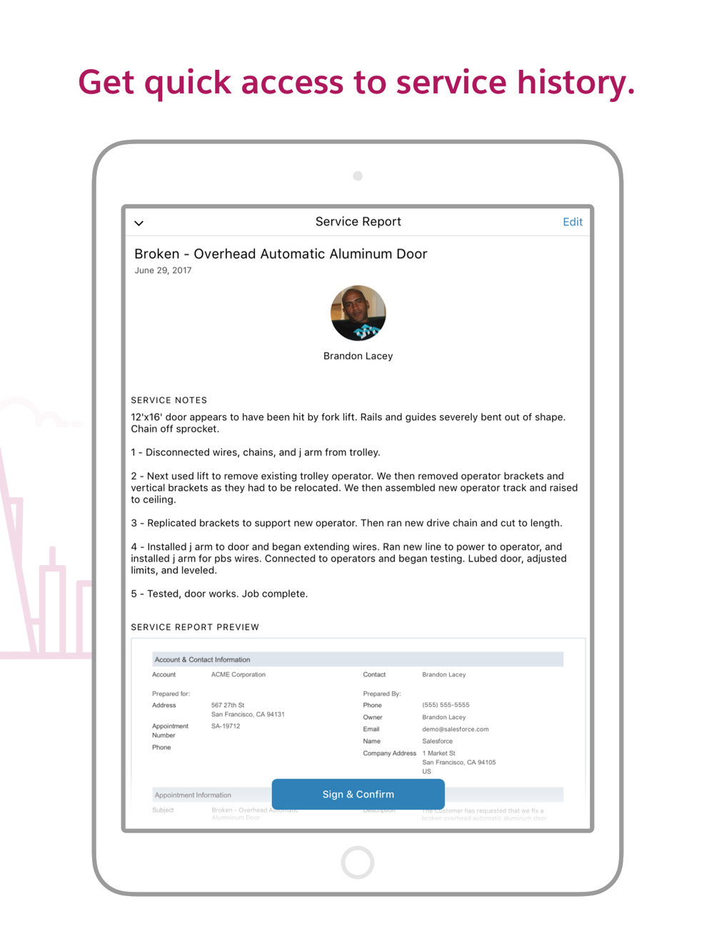- Easy-to-use thanks to an optimized, clear, and beautiful user interface to view service appointments, work orders, inventory, service history and other important information from anywhere.