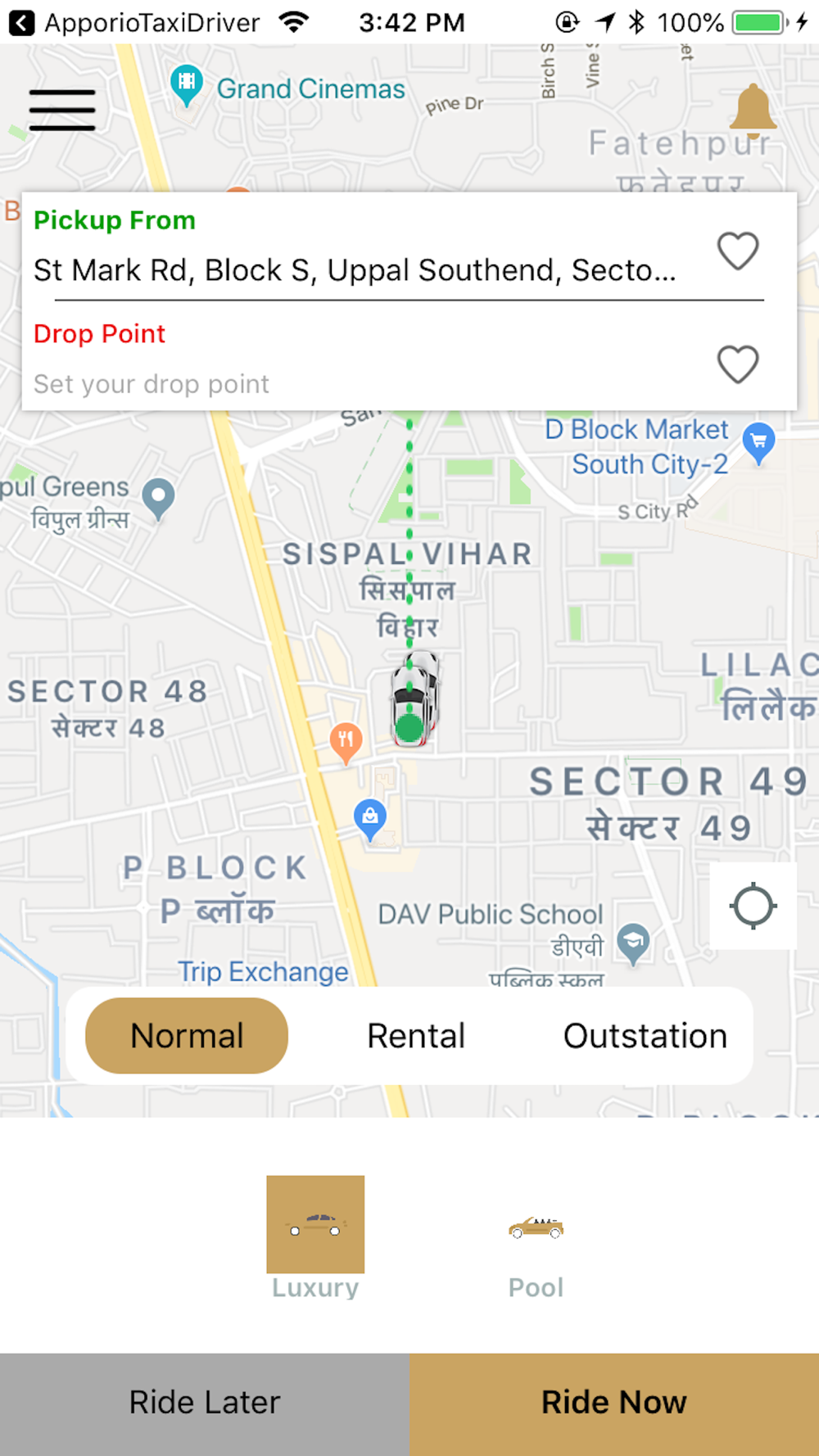 • Once driver accept a booking request, his screen changes into a map screen which shows the path to Customer's Pick Up Location