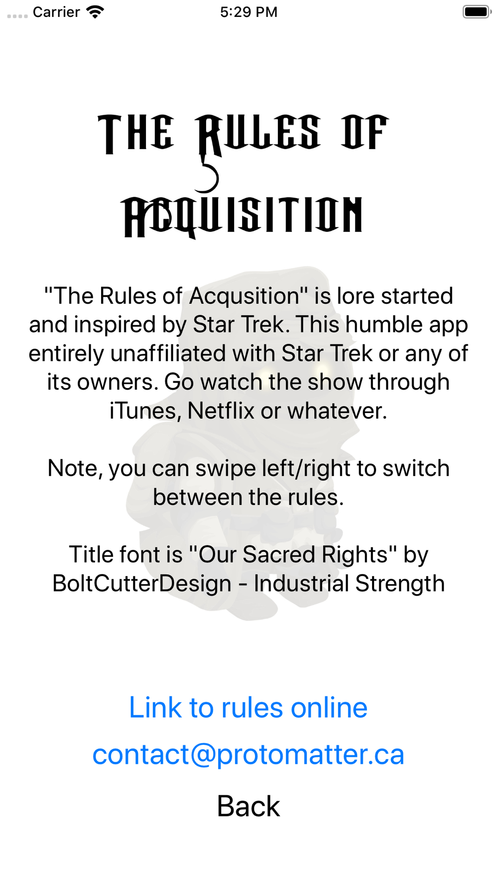 This silly app contains an extensive collection of the Rules of Acquisition, some are actually astute and others are reasonably offensive. The rules here are not official in any capacity, but strive to accurately capture those reminiscent of the show.