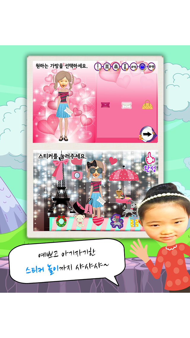 공주같이 예쁜 우리아이 얼굴을 바탕으로 예쁜 옷을 입히고, 다양한 악세사리도 코디하는 콘텐츠!