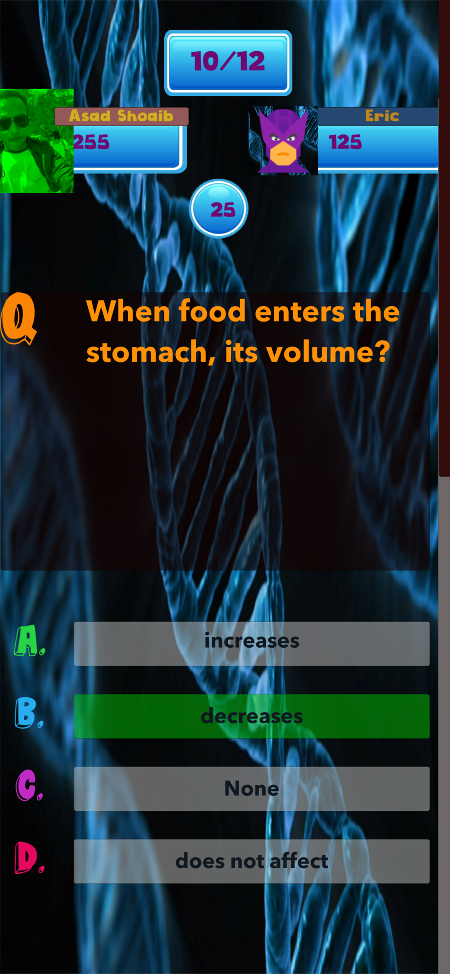 This Biology game helps user to sharpening their knowledge and senses, help them to prepare for exams or tests which are based on all branches of Biology and helps them to increase their knowledge. This app targets people of all ages, even children could enjoy tests created by this app and could enhance their Biology Knowledge. This app con be used for the preparation of School, Collage and Universities quizzes and also for entry tests. This app contains cool features like coloring the buttons green if the answer is correct otherwise coloring the button red because the answer is wrong. It provides multi-player functionality which enables you to play against the players around the world. It contains good graphics and less Ads. This app is extremely efficient, it is developed in such a way so that it could run smoothly in any device.