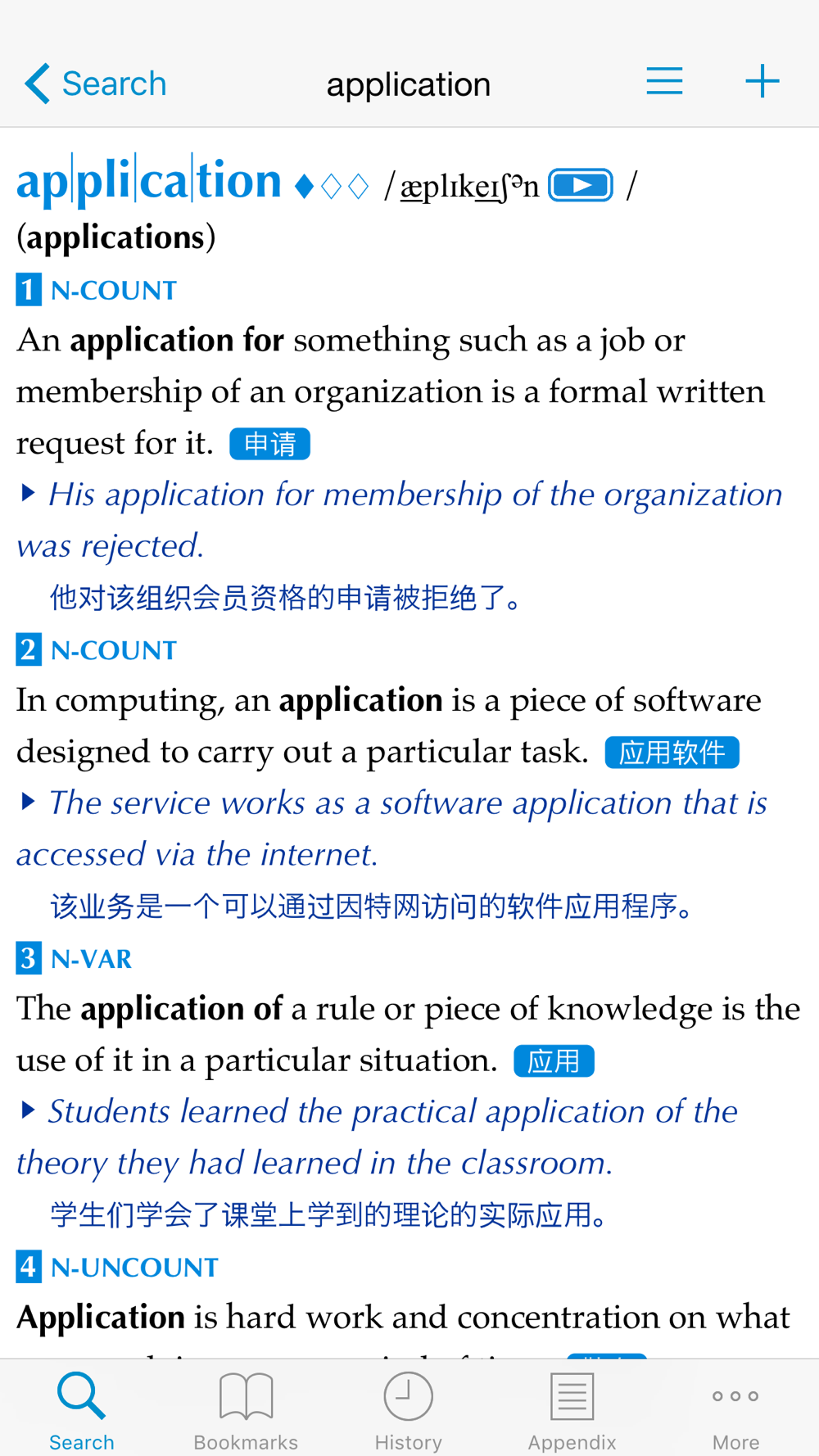 毋庸置疑,与我公司其他的辞典同样,它还内置有“标题搜索”、“例句搜索”、“词组搜索”功能,可以准确搜索出所需的信息。在“例句搜索”中,它可以通过各种各样的代表性例句搜索出所需要的措辞,这在书写邮件等英文文件时将是一个强有力的功能。另外,由于支持“App Extension(自定义操作)”,利用本产品可以搜索出在 Safari 中选出的单词。