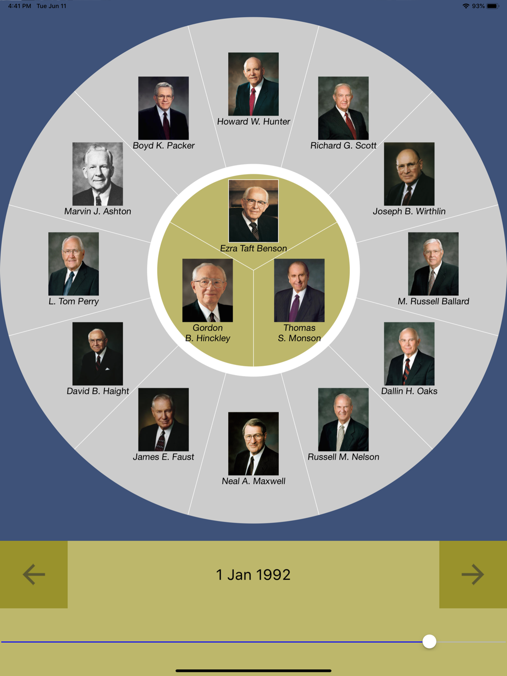Explore Church History from a new perspective! "Latter-day Apostles" lets you see what the First Presidency and Quorum of the Twelve Apostles looked like at any point in modern history. Tap any apostle's picture to read biographical information.