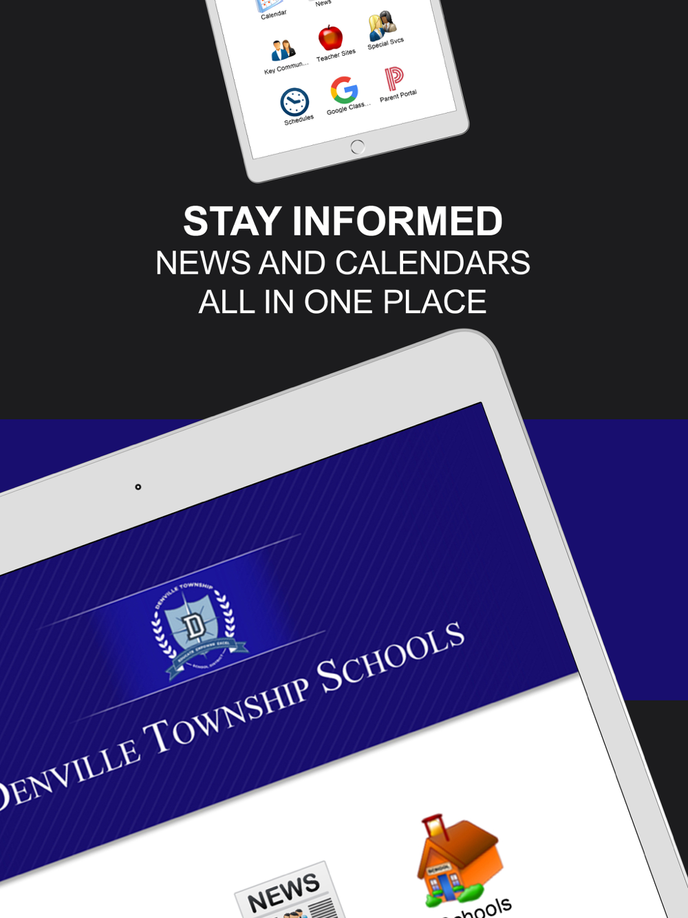 With the Denville Twp Schools mobile app, your school district comes alive with the touch of a button. Easily navigate through current news and events or check out the latest updates with social media like Facebook and Twitter. Quickly retrieve contact information, sporting scores, lunch menus, and more! It’s your school district available at your fingertips.