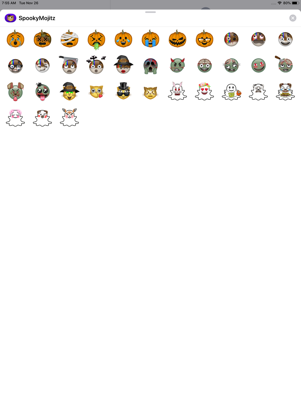 Spook up your conversations with these Mojitz Halloween stickers. With over 35 scary themed stickers, this is the perfect pack to haunt your friends. Go get your freak on and download NOW!