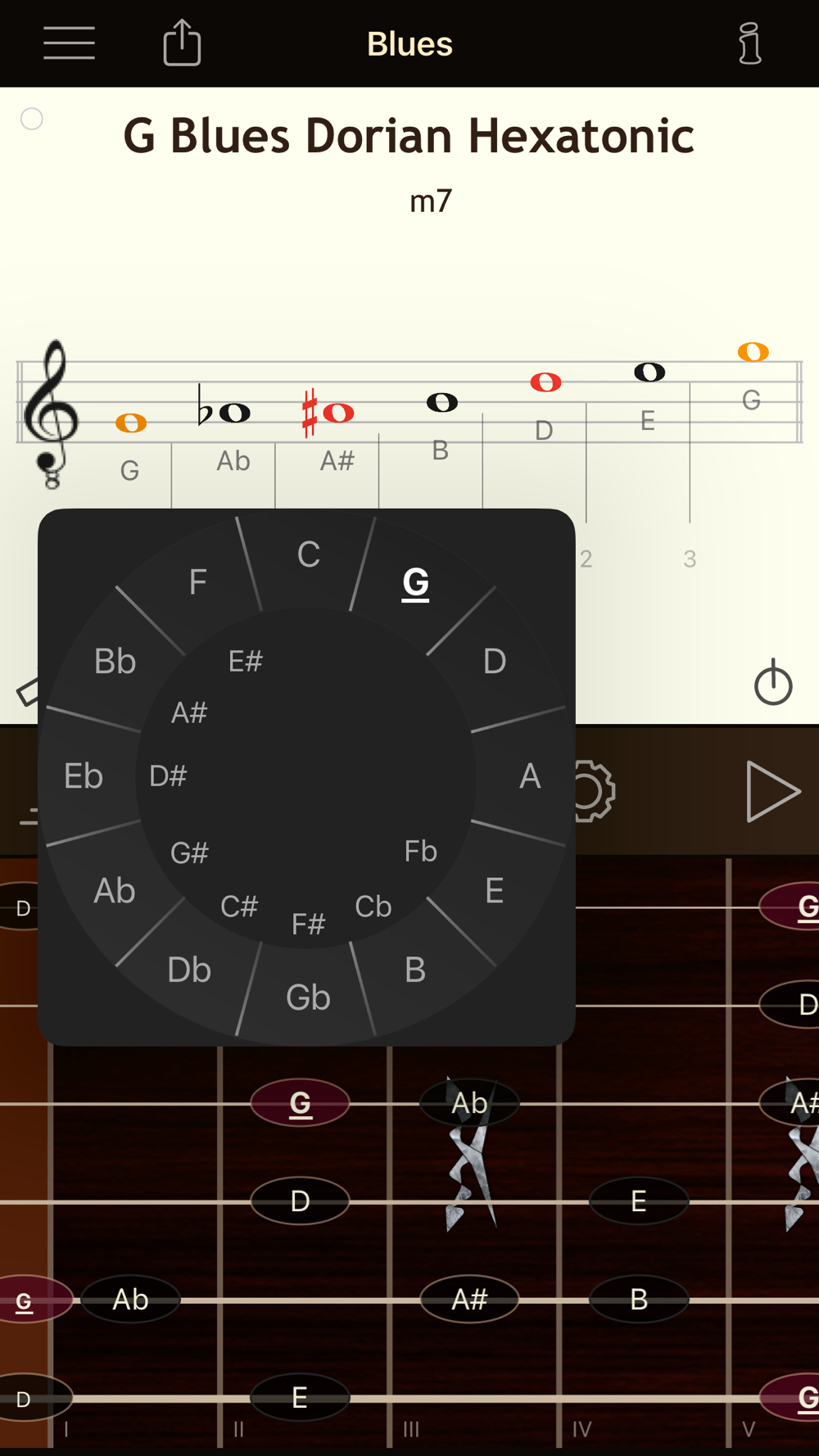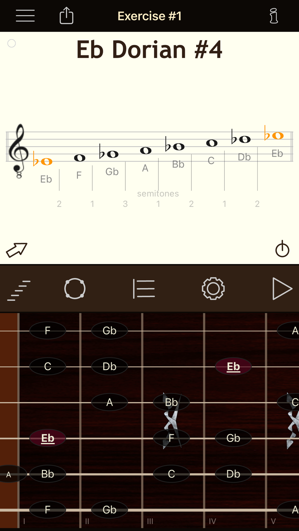 Scales are listed by name in a master list that also contains additional information like type. The notation display is automatically updated with each new selection. Light text coloring as well as the scale type indicator help easily distinguishing between different types. Scale configurations are saved in exercise documents that can be shared. Each document is set to a specific instrument and saves scale information as well as instrument position. Documents also allow for instrument recordings. These can be adjusted in speed and used as play-along exercise. Additional playback functions include count-in and auto-reverse.