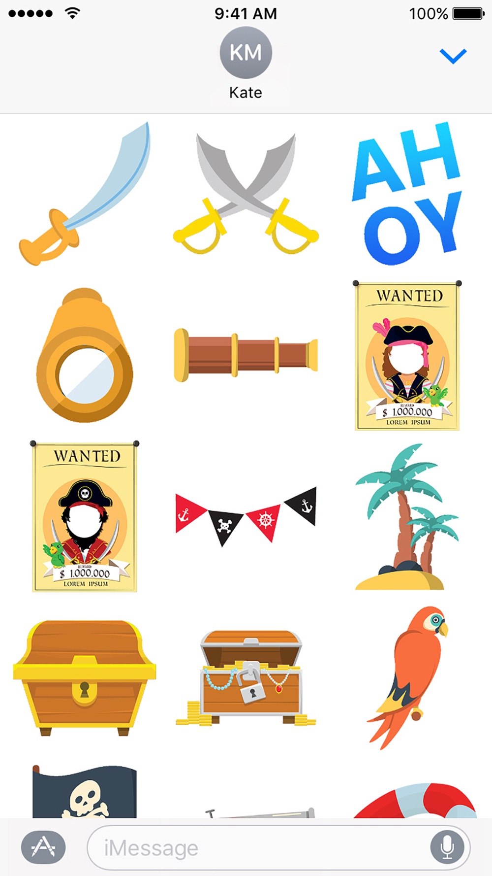 Get the best sticker pack on the seven seas! Transform your messages with the Pirate Stickers Dress Up Pack! Arrr! Featuring over 50 fun stickers including 10 talk-like-a-pirate speech bubbles!