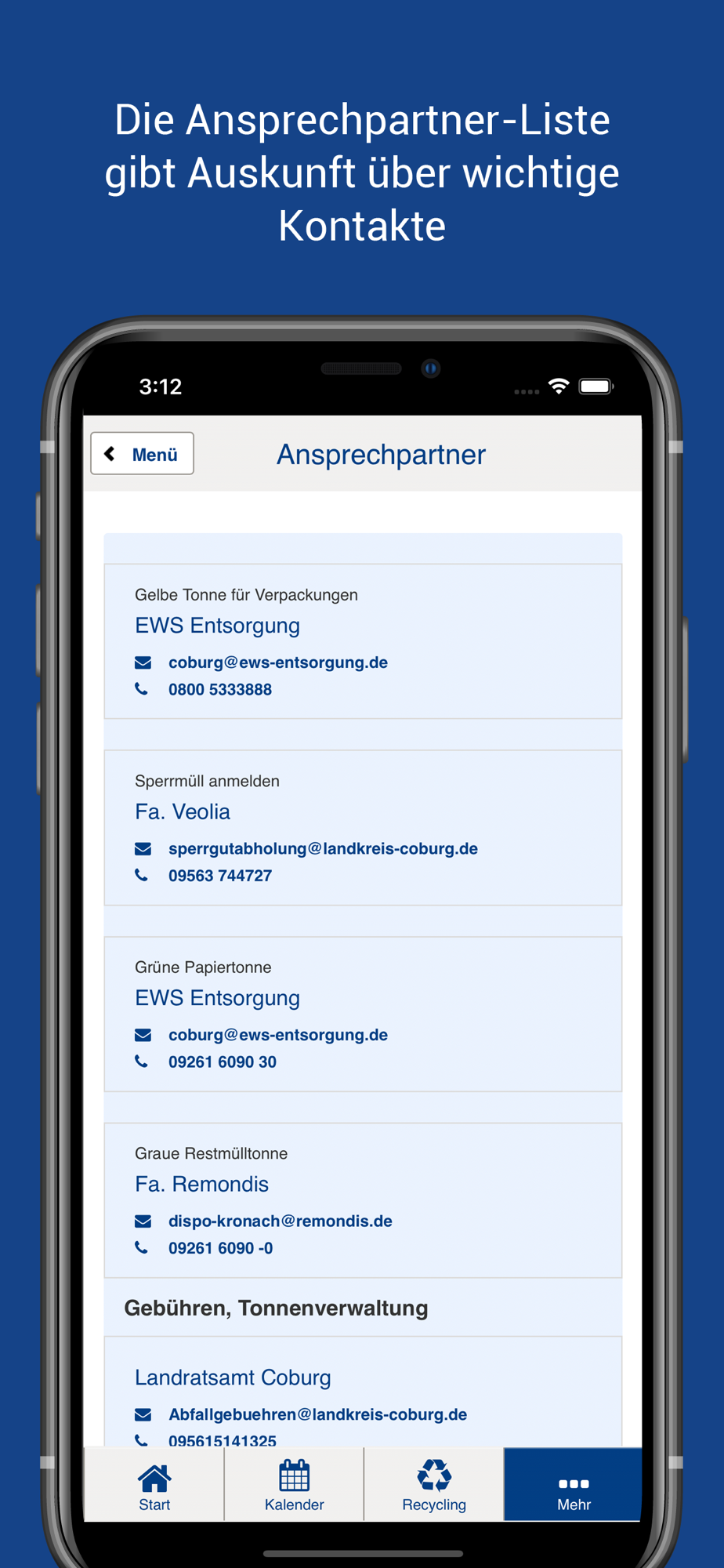 * Annahmestellen für Abfälle aller Art mit Ortsangabe und Öffnungszeiten, inkl. Kartenansicht und Navigation.